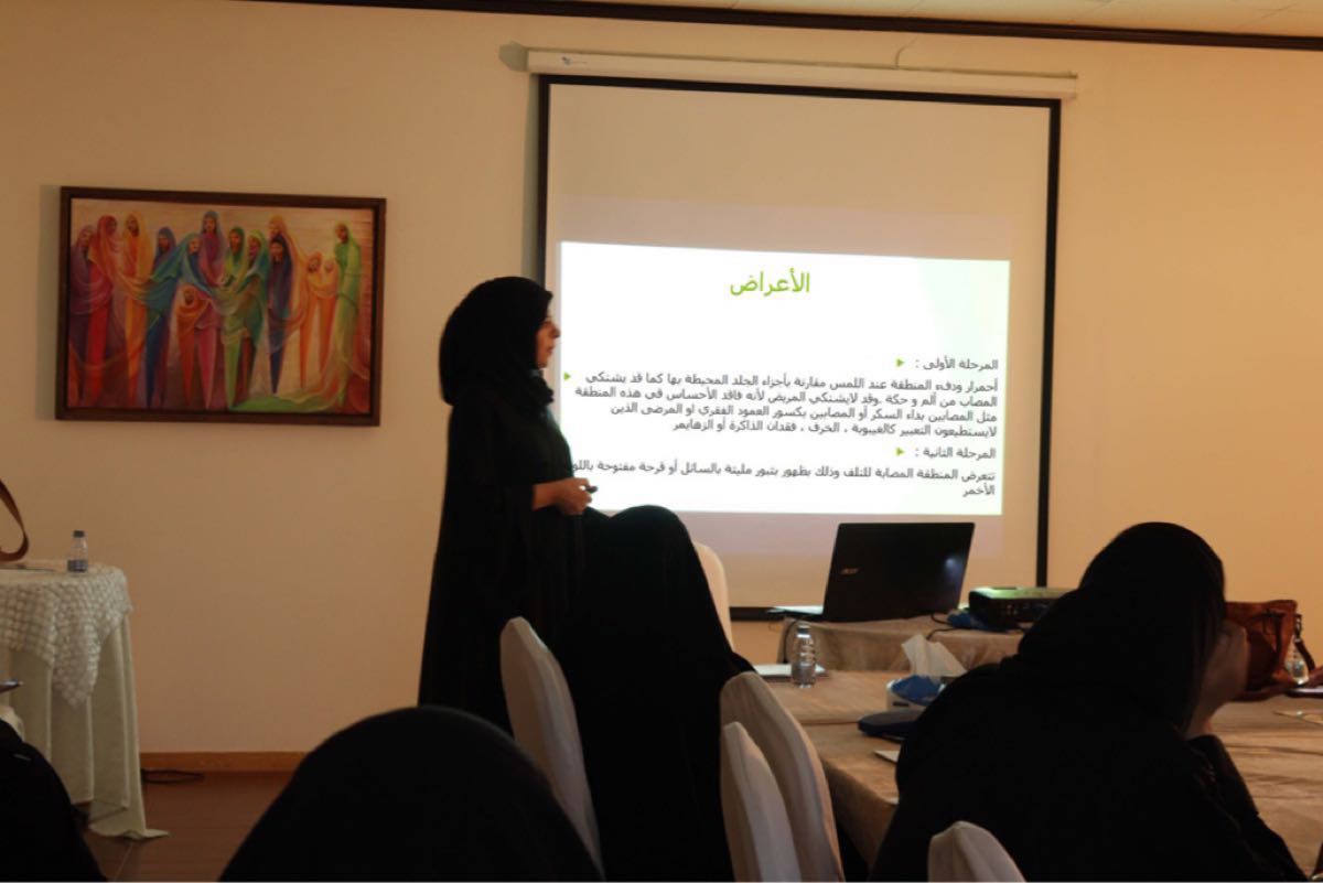 تدرجت الأخصائية نبوغ عبد الباقي، عبر 4 مراحل، في ذكر أعراض قروح الفراش لدى كبار السن، وذلك في ختام مشروع رعاية كبار السن الذي نظمته جمعية العطاء النسائية الأهلية بالقطيف، بالتعاون مع مستشفى القطيف المركزي، بحضور أكثر من 20 مستفيدة.