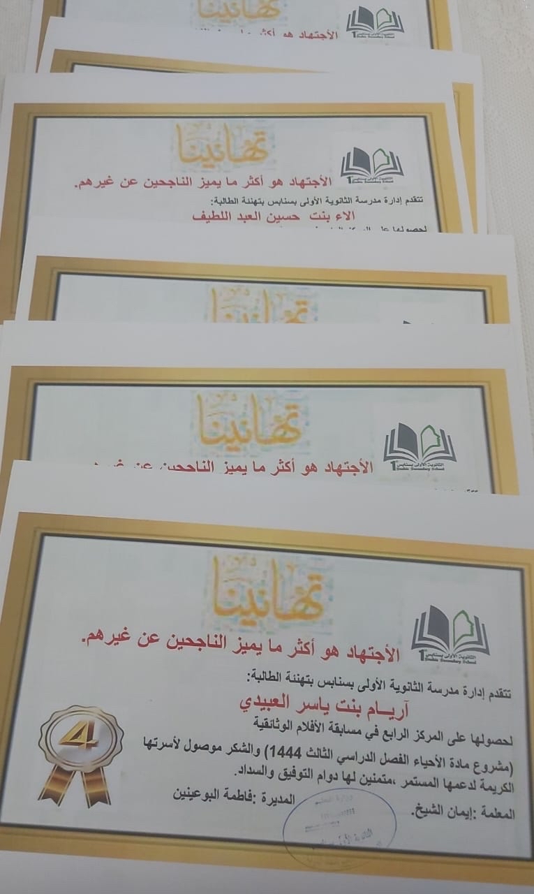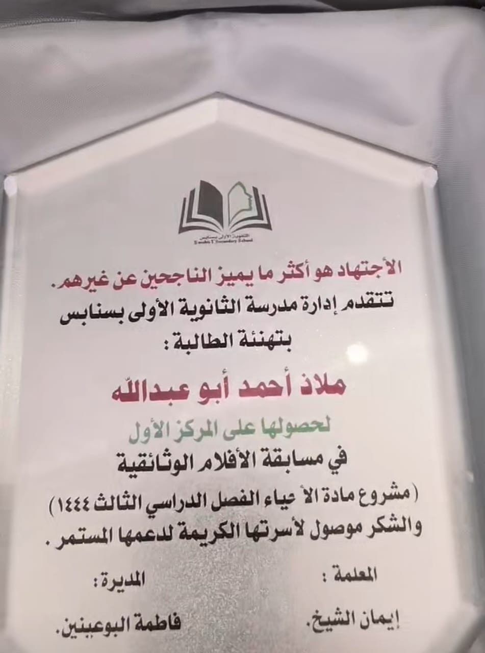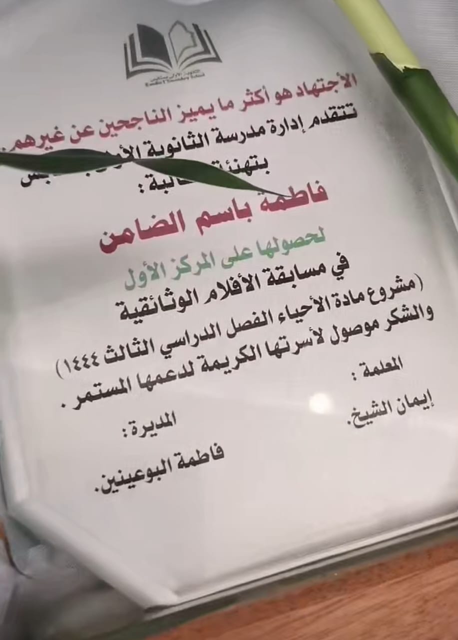 ومن جهتها، أهدت الطالبة مريم الحماقي المعلمة إيمان الشيخ شهادة تذكارية لإنتاج فيلم صائبة أم خائبة، مثنية على مساهمة المعلمة معهن في إنتاج هذا الفيلم الوثائقي الذي يتحدث عن عملية التهجين وتأثيرها على النبات.
