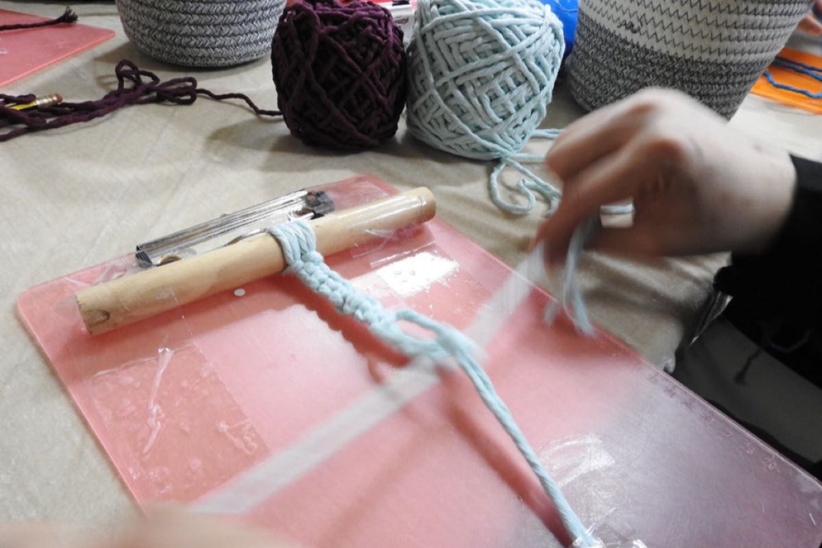 وعن بداية البرنامج، قالت: ”بدأنا بالتعليم على عقد الخيوط من خلال عمل فواصل الكتب والميداليات كأبسط أنواع المشغولات اليدوية من هذا النوع، وذلك خلال 3 ساعات في ورشة عمل حماسية اتسمت ببث روح العمل الفني، واللمسات الإبداعية في جو أسري احتضنت فيه العطاء الفتيات من هذه الفئة بقصد رفع مستوى الحس الفني الإبداعي للوصول بالفتيات نحو الإنتاجية“.
