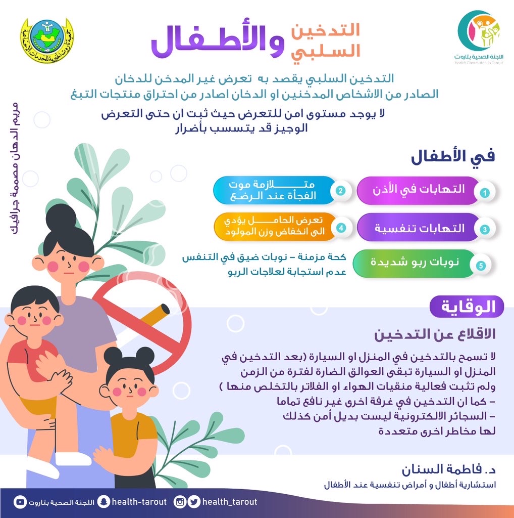 وأوضحت ”السنان“، في تغريدة نشرتها اللجنة الصحية بتاروت، أن التدخين السلبي يقصد به تعرض غير المدخن للدخان الصادر من الأشخاص المدخنين أو الدخان الصادر من احتراق منتجات التبغ.