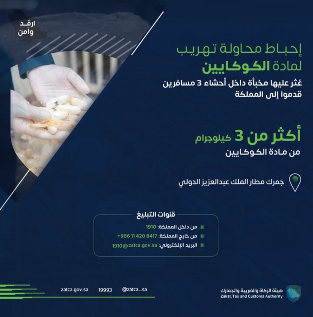 تمكنت هيئة الزكاة والضريبة والجمارك، في مطار الملك عبدالعزيز الدولي بجدة، من إحباط محاولة تهريب أكثر من 3 كجم من مادة ”الكوكايين“ المخدرة.