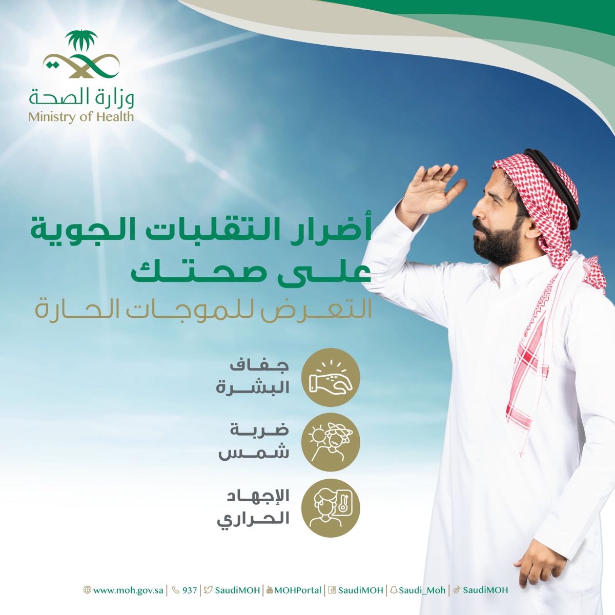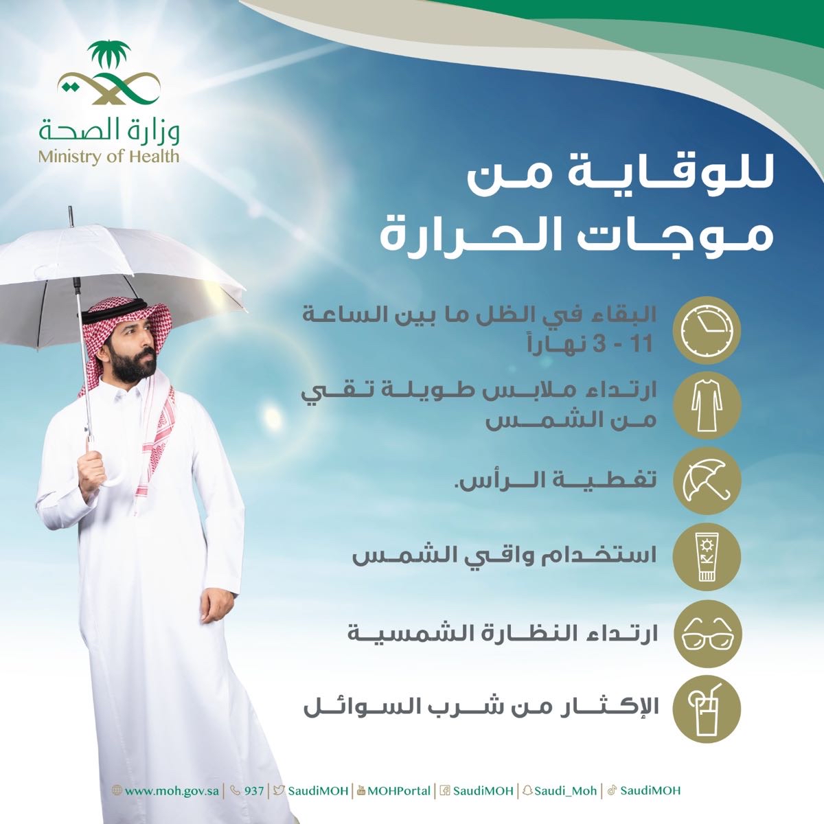 ونشرت الوزارة في حسابها في ”تويتر“ أنفوجرافيك يبين تلك المخاطر، ومن أبرزها، جفاف البشرة، ضربات الشمس، والإجهاد الحراري، موضحة أن من أهم للوقاية من موجات الحرارة، البقاء في الظل ما بين الساعة 11 إلى الساعة 3 نهاراً، ارتداء ملابس طويلة تقي من الشمس، تغطية الرأس، استخدام واقي الشمس، وارتداء النظارة الشمسي، بالإضافة إلى شرب المياه والسوائل بكميات كافية.