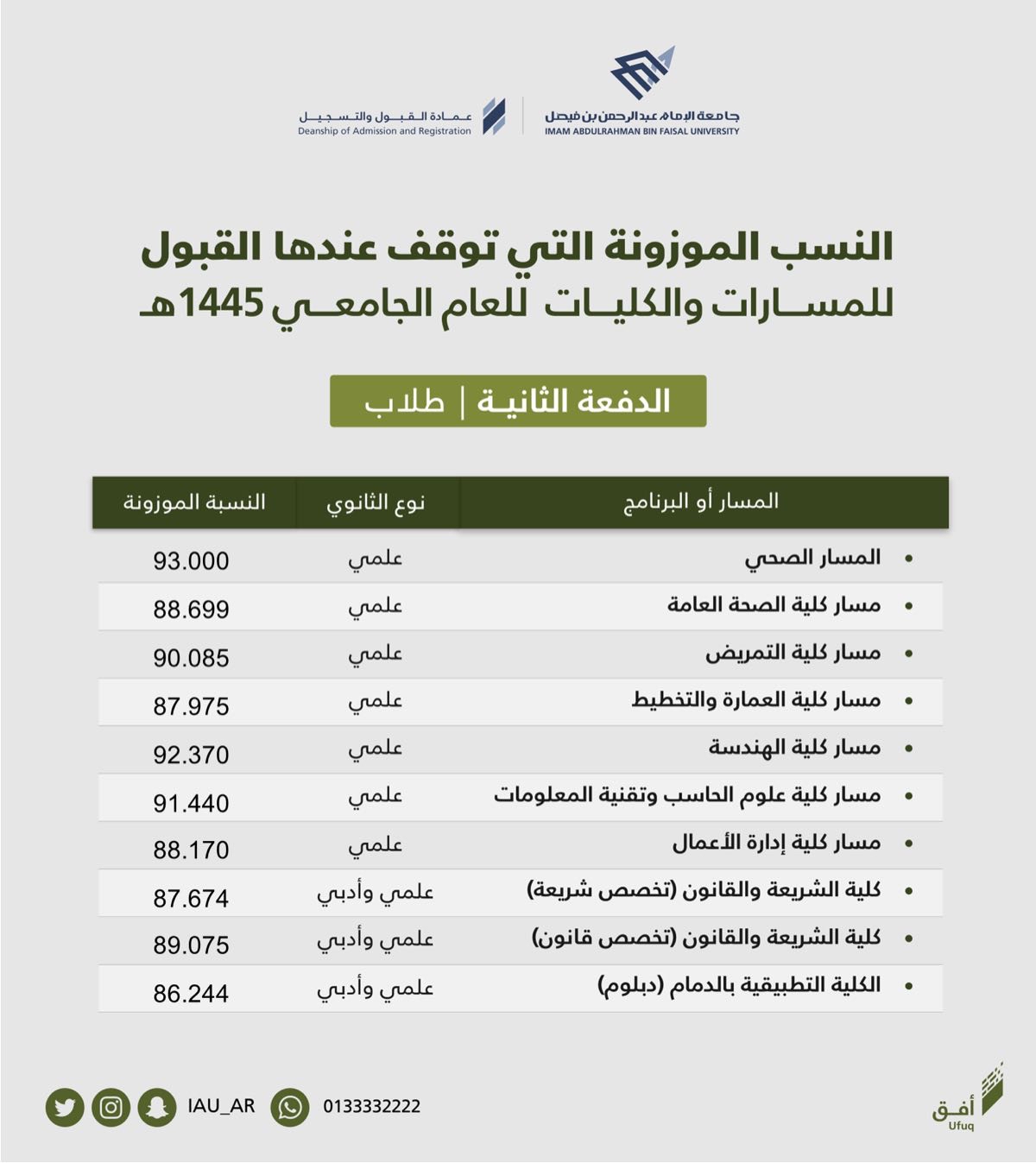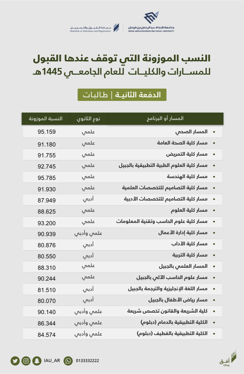 أعلنت عمادة القبول والتسجيل في جامعة الإمام عبد الرحمن بن فيصل، الدفعة الثانية من الطلاب والطالبات المرشحين والمرشحات للقبول في مسارات السنة التحضيرية والبرامج الأخرى للعام الجامعي 1445ه.