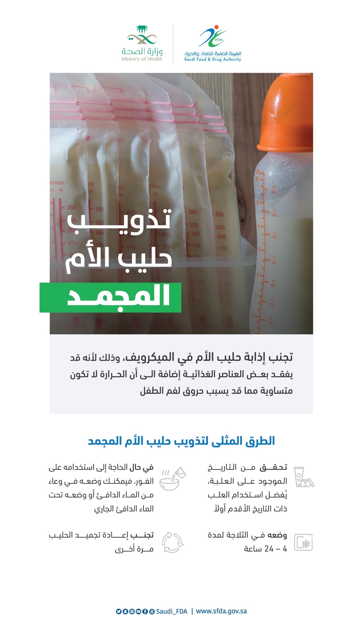 تحذير هام.. «الغذاء والدواء» تحذر الأمهات من تذويب حليب الأم المجمد عبر الميكروويف