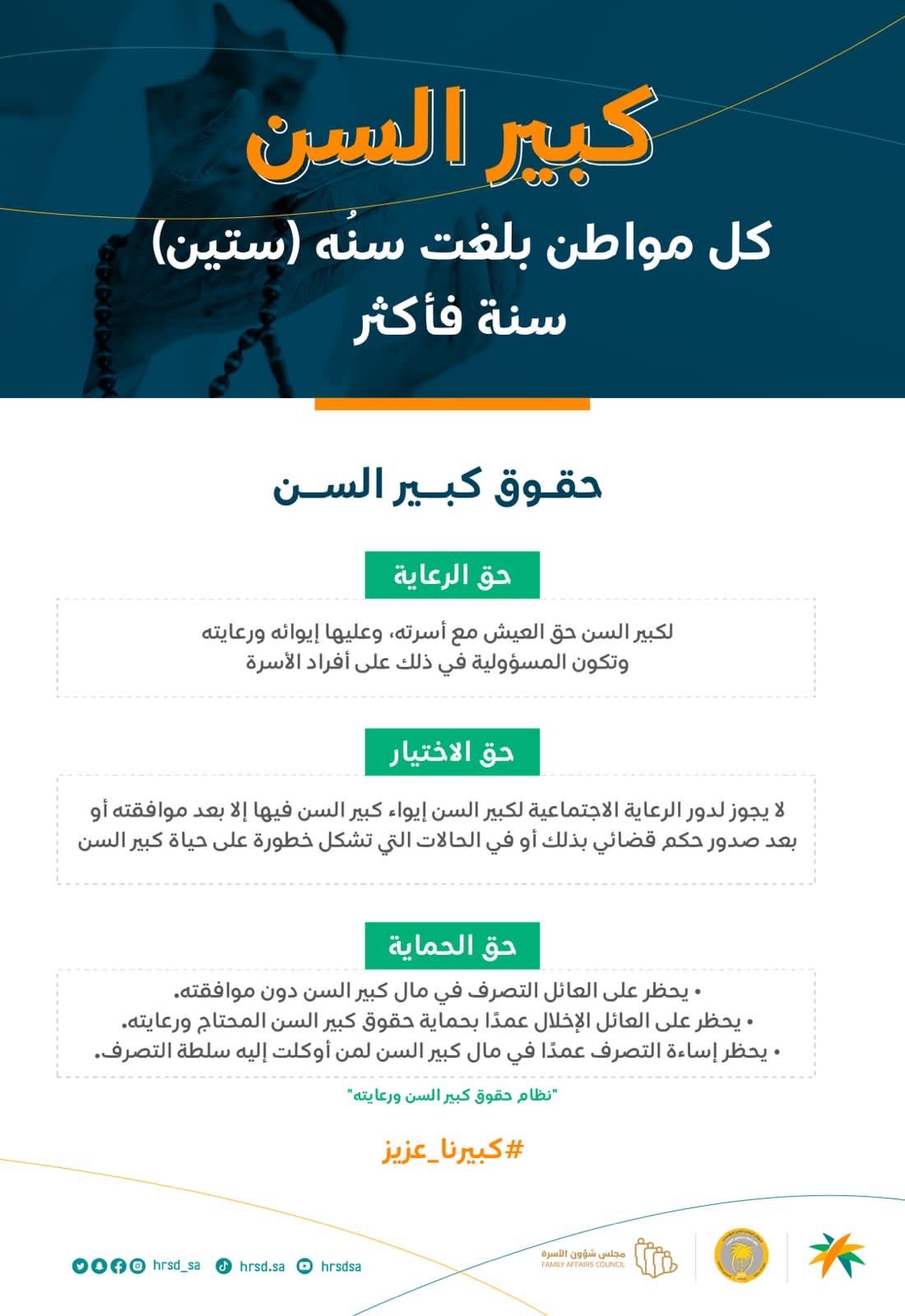 وتهتم المملكة بحقوق كبار السن بشكل كبير، حيث صدر المرسوم الملكي رقم «م/ 47» في عام 1443 هـ بما يحفظ كرامتهم وخصوصيتهم واستقلاليتهم وكذلك يوفر لهم الرعاية والخدمات إيمانا ووفاء لهم.