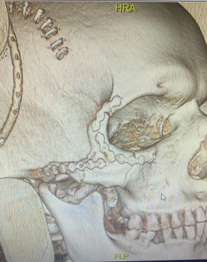 ولخطورة الحالة، تم على الفور تشكيل فريق طبي متكامل، واستكمال كافة الفحوصات الطبية والإشعاعية التشخيصية، والتي بينت وجود كسور متعددة في عظام الوجه، وتهشم في عظم الوجنة وجروح متهتكة في الوجه.