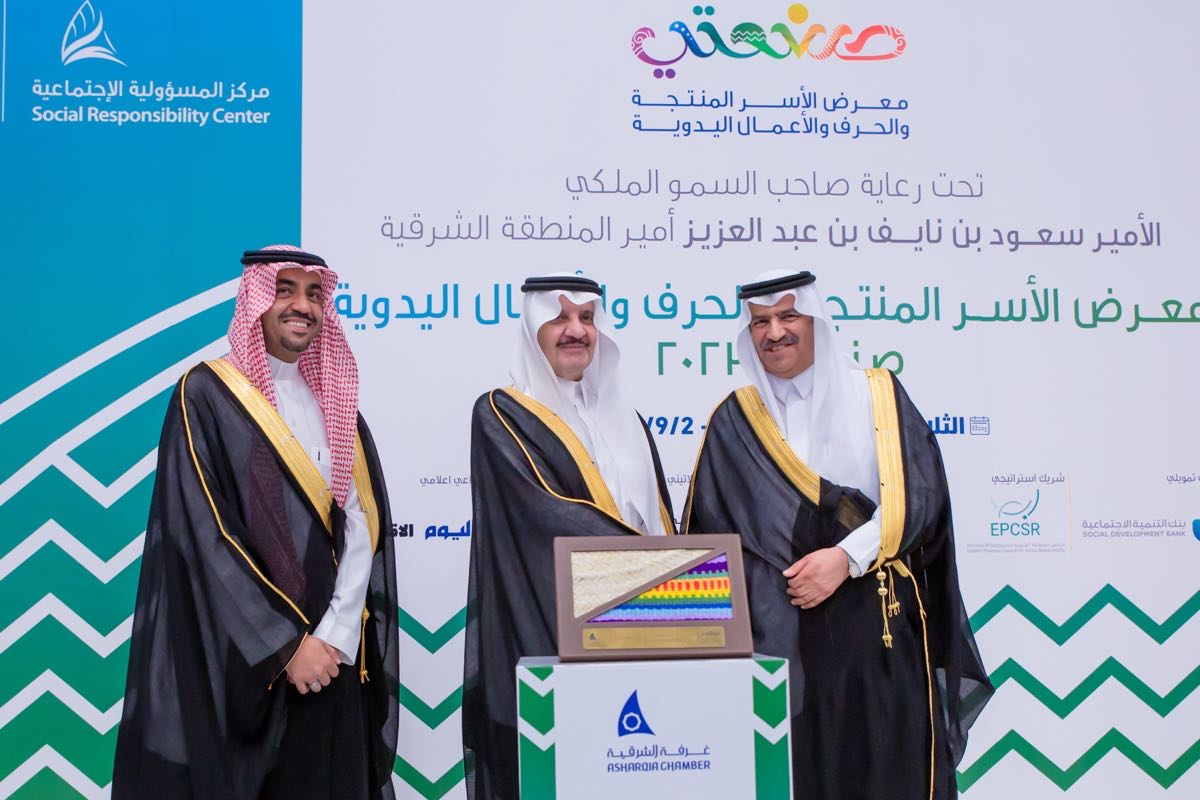 وكرَّم أمير الشرقية رعاة «صنعتي 2023 م» والداعمين للمعرض من الجهات الحكومية والخاصة، وتسلّم درعًا تحمل هوية المعرض في نسخته السادسة، مستمعًا خلال جولته إلى شرح من رئيس الغرفة بدر الرزيزاء، حول المعرض وأجنحته وأهدافه الرامية إلى ترسيخ ثقافة العمل الحر بين أوساط الأسر المنتجة وأصحاب الحِرف والأعمال اليدوية.