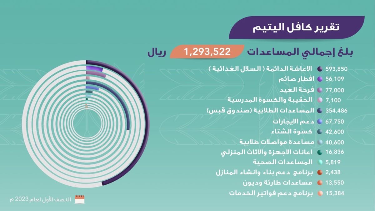 وتابع: بلغ إجمالي المساعدات في لجنة كافل اليتيم نحو 1,293,522 ريالا، بعد إضافة 6 أُسر، ليصبح عدد المستفيدين في اللجنة 71 أُسرة.