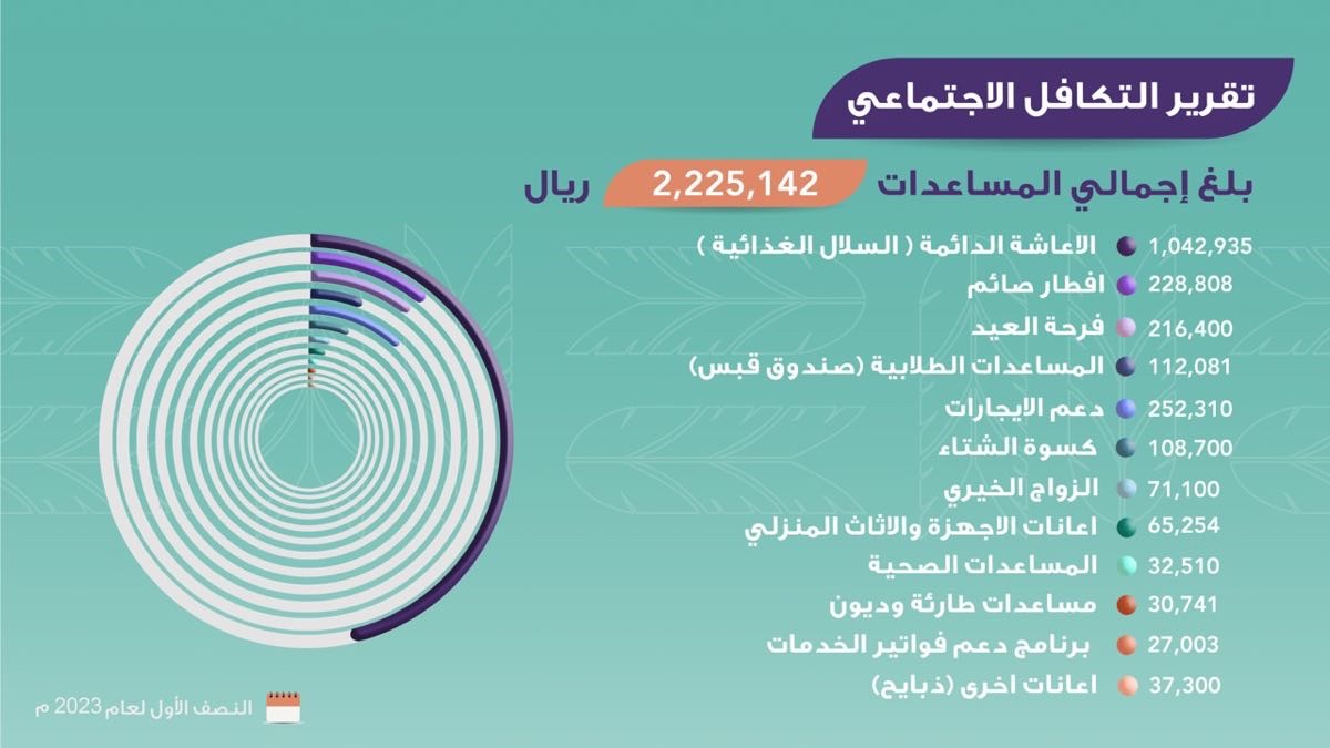 وأشار رئيس لجنة المساعدات حسن المرهون إلى أن لجنة التكافل الاجتماعي شهدت إضافة 12 أُسرة خلال النصف الأول من السنة، ليصل عدد المستفيدين في هذه اللجنة 304 أُسرة، بمجموع مساعدات بلغت 2,225,142 ريالًا.