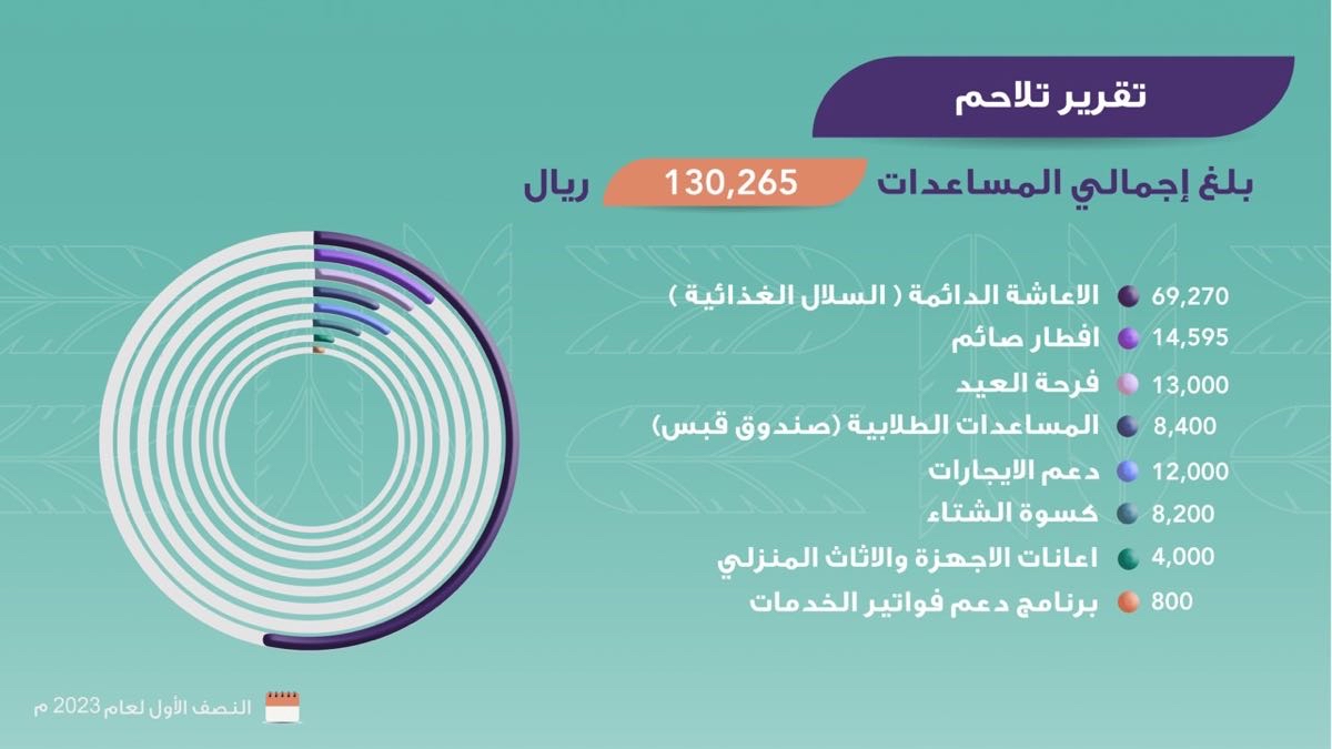 وأضيفت أُسرة واحدة للجنة تلاحم ليبلغ عدد المستفيدين في هذه اللجنة 11 أُسرة، وبلغ إجمالي المساعدات فيها 130,265 ريالًا.
