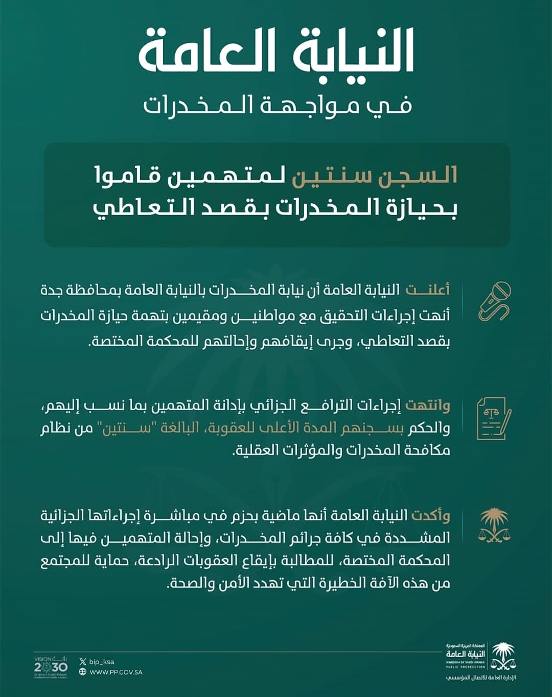 وانتهت إجراءات الترافع الجزائي بإدانة المتهمين بما نسب إليهم، والحكم بسجنهم المدة الأعلى للعقوبة، البالغة ”سنتين“ من نظام مكافحة المخدرات والمؤثرات العقلية.