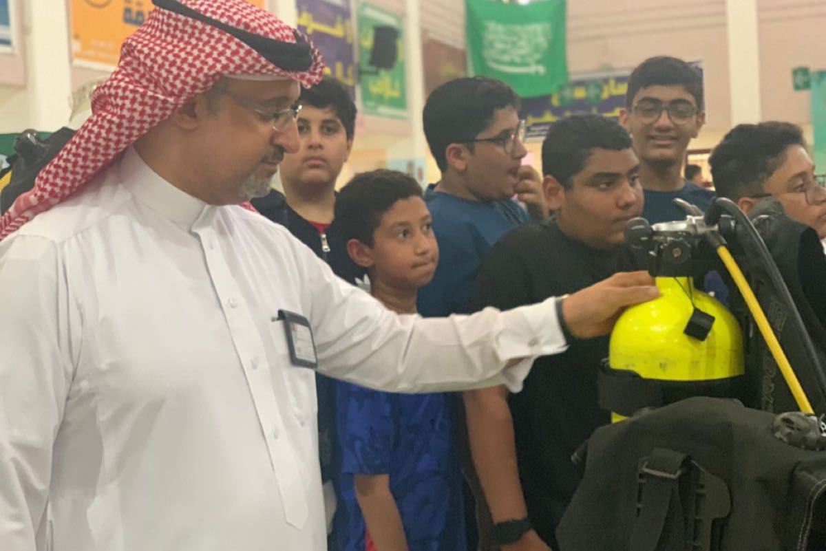 من جهته نفَّذ مدرب الغوص الشمري تجربة ارتداء أدوات الغوص على بعض طلاب المدرسة، سترة الغوص وارتداء الزعانف وحمل أسطوانة الهواء والتنفس من خلالها، وكأنه يغوص تحت الماء ليعيش عالم الغوص في روحه، ما أضفى البهجة على الطلاب.