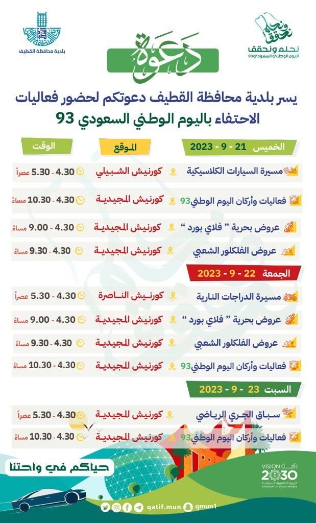 أعلنت بلدية محافظة القطيف عن فعاليات اليوم الوطني السعودي ال 93، التي ستقام تحت شعار ”نحلم ونحقق“، حيث ستشهد المحافظة تجمعاً لسكانها وزوارها على الواجهة البحرية بكورنيش المجيدية.