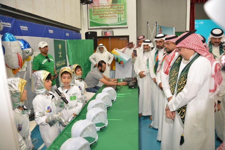 جذب ركن ”التحليق نحو الفضاء“ الذي شارك فيه ستة طلاب من مدرسة جعفر الطيار الابتدائية بأم الحمام الحضور في حفل اليوم الوطني التابع لمكتب التعليم بالقطيف.