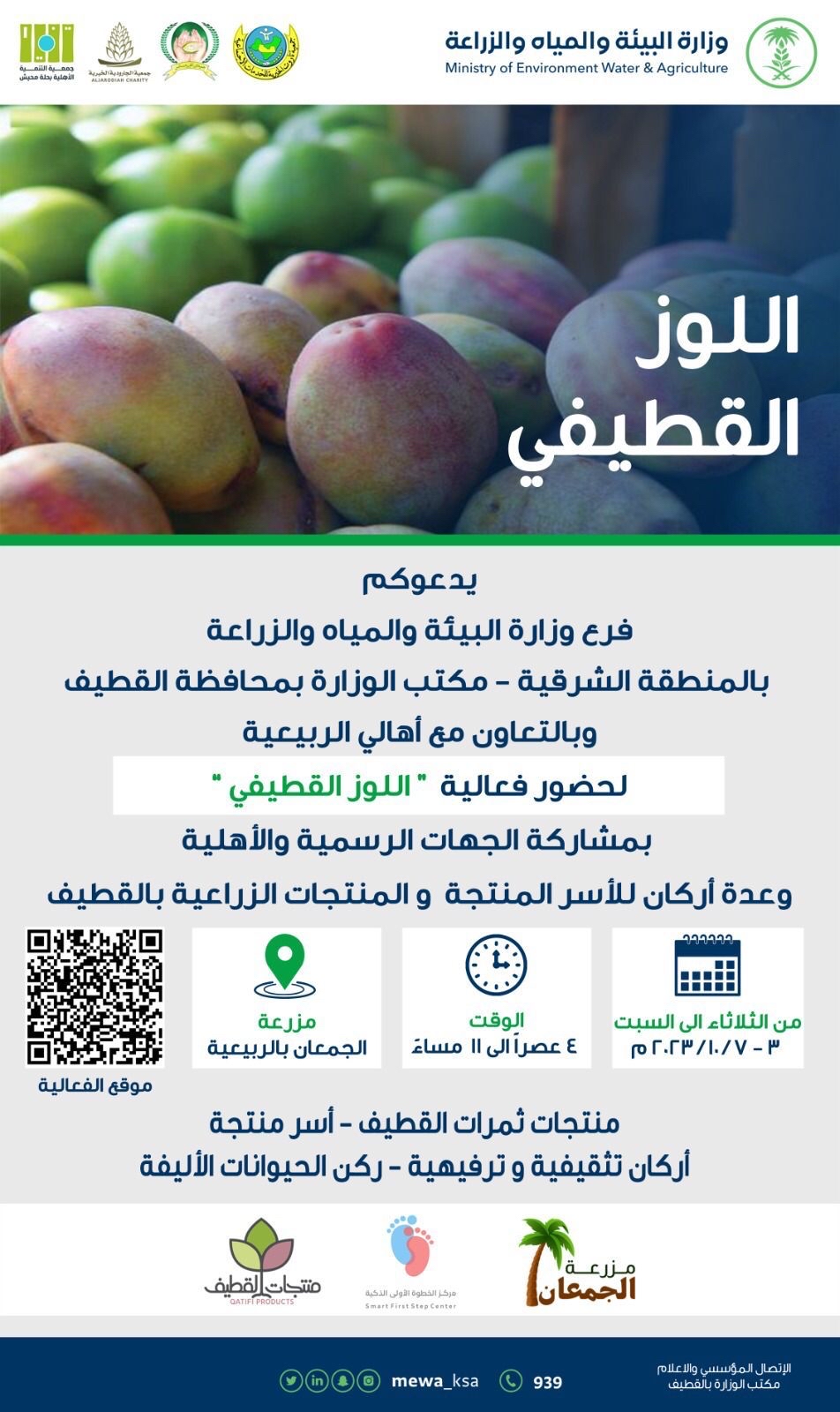 ينظم مكتب وزارة البيئة والمياه والزراعة بمحافظة القطيف، فعالية ”اللوز القطيفي“، بالتعاون مع أهالي الربيعية، وبمشاركة الجهات الرسمية والأهلية.