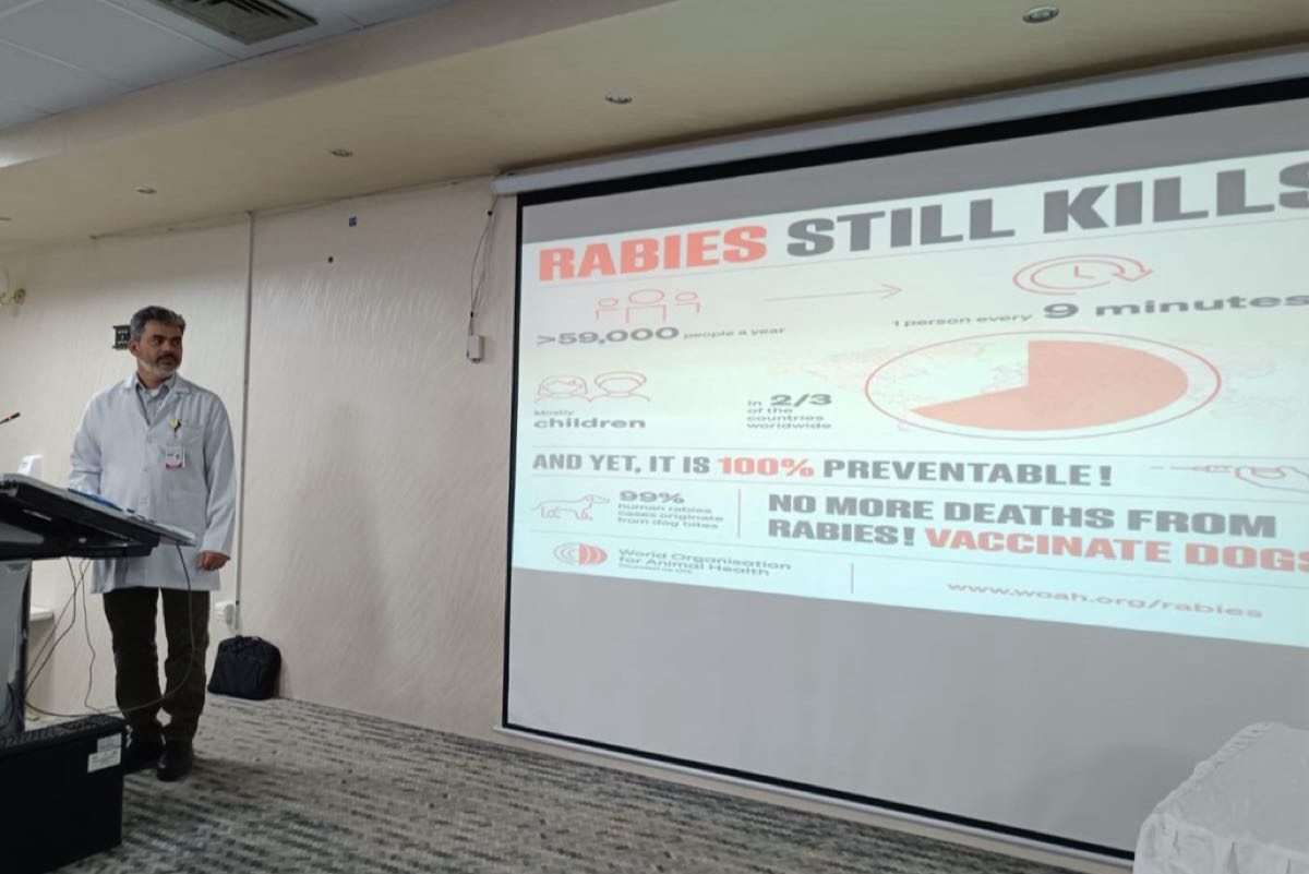وتناول المحاضران الدكتور جاسم المقرن، والدكتور مؤيد الشخل، داء الكلب، والذي يمكن الوقاية منه باللقاحات، وأوضحا أنه يتسبب في وفاة عشرات الآلاف كل عام، خاصة في آسيا وأفريقيا، 40% منهم من الأطفال دون سن 15 عامًا.