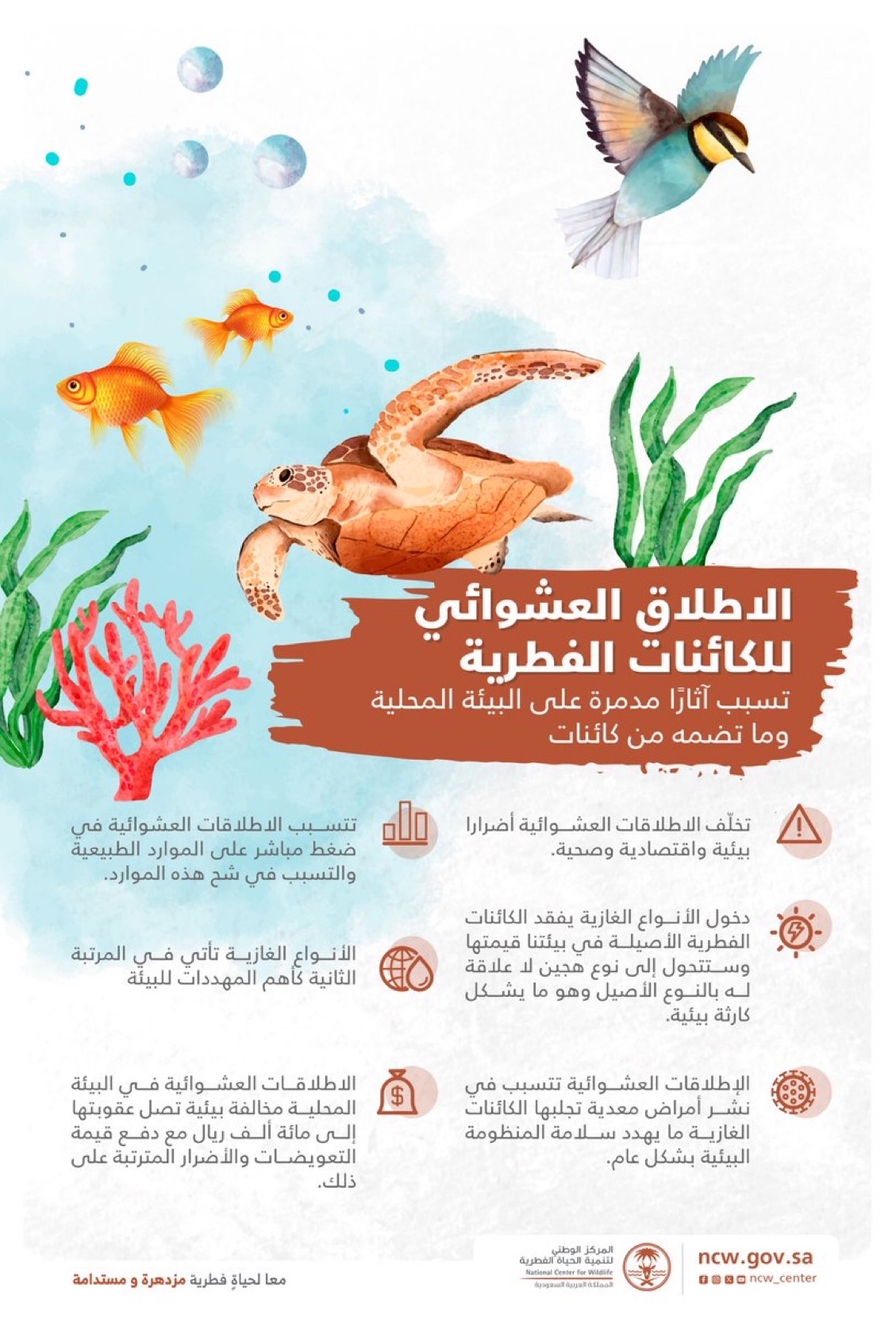حذر المركز الوطني لتنمية الحياة الفطرية من خطورة الإطلاق العشوائي للكائنات الفطرية في البيئة المحلية، مؤكدًا أنها تحمل آثارًا مدمرة بيئيًا واقتصاديًا.