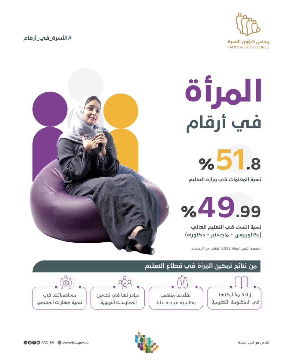 ارتفعت نسبة المعلمات في وزارة التعليم بشكل ملحوظ، وفقًا لإحصائية نشرها مجلس شؤون الأسرة. وبلغت النسبة الجديدة 51,8%، مما يشير إلى تزايد دور المرأة في مجال التعليم.