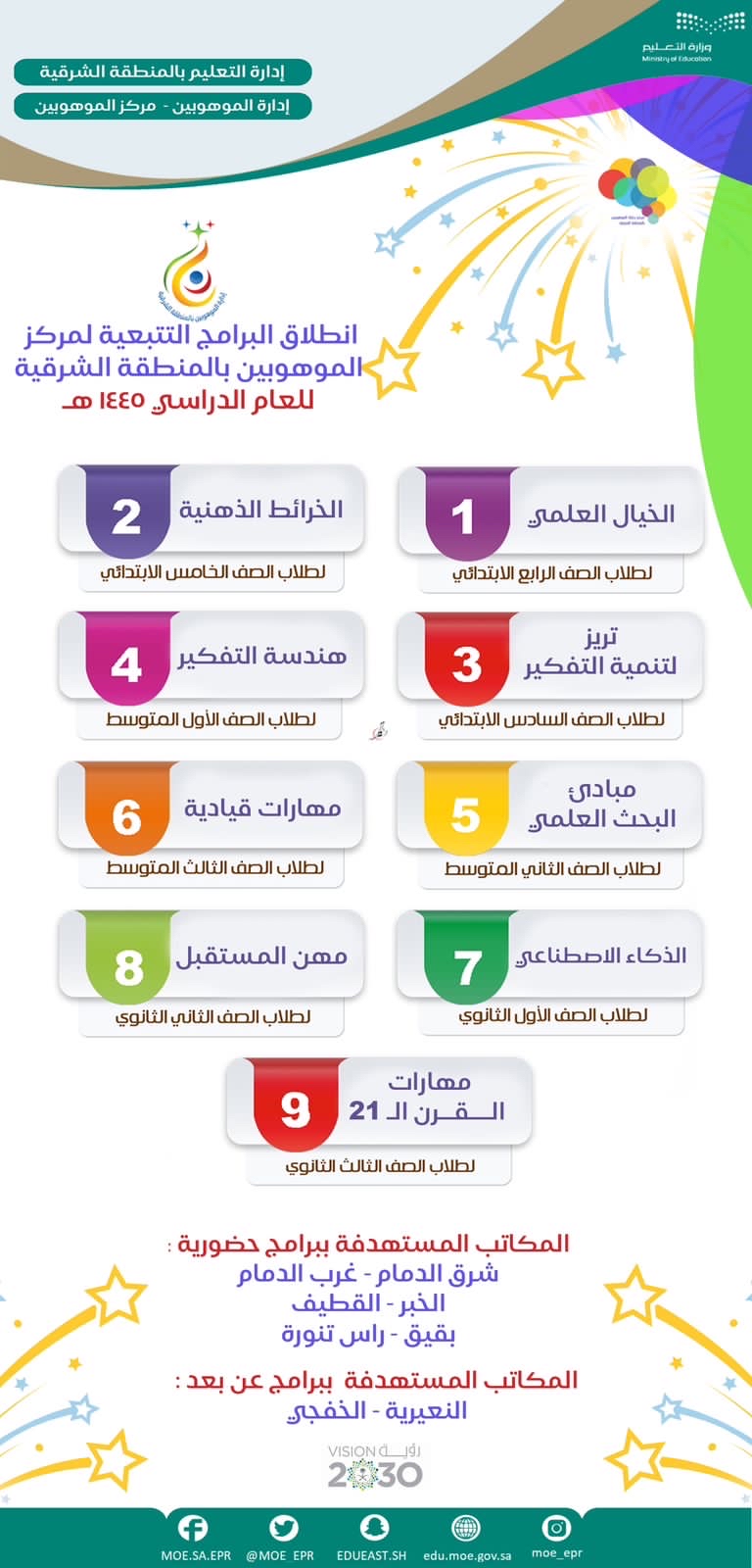 وأوضح المتحدث الاعلامي لتعليم الشرقية سعيد الباحص، أن البرامج التدريبية تهدف إلى اكتشاف الموهوبين ورعايتهم وتوجيههم إلى المجالات التي يبدعون فيها، وتوفير الفرص المناسبة لهم للتنمية والتعلم، وإعدادهم للمستقبل.
