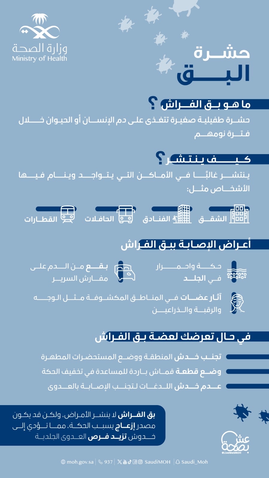 قدمت وزارة الصحة إنفوجرافا توعويا عن حشرة بق الفراش وكيف تنتشر، وما هي أعراض إصابة الإنسان بها.