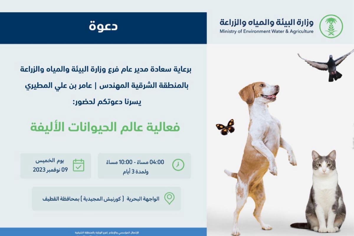 ينظم فرع وزارة البيئة والمياه والزراعة بالمنطقة الشرقية فعاليات ”عالم الحيوان الأليفة“ في الواجهة البحرية ”كورنيش المجيدية“ بمحافظة القطيف.