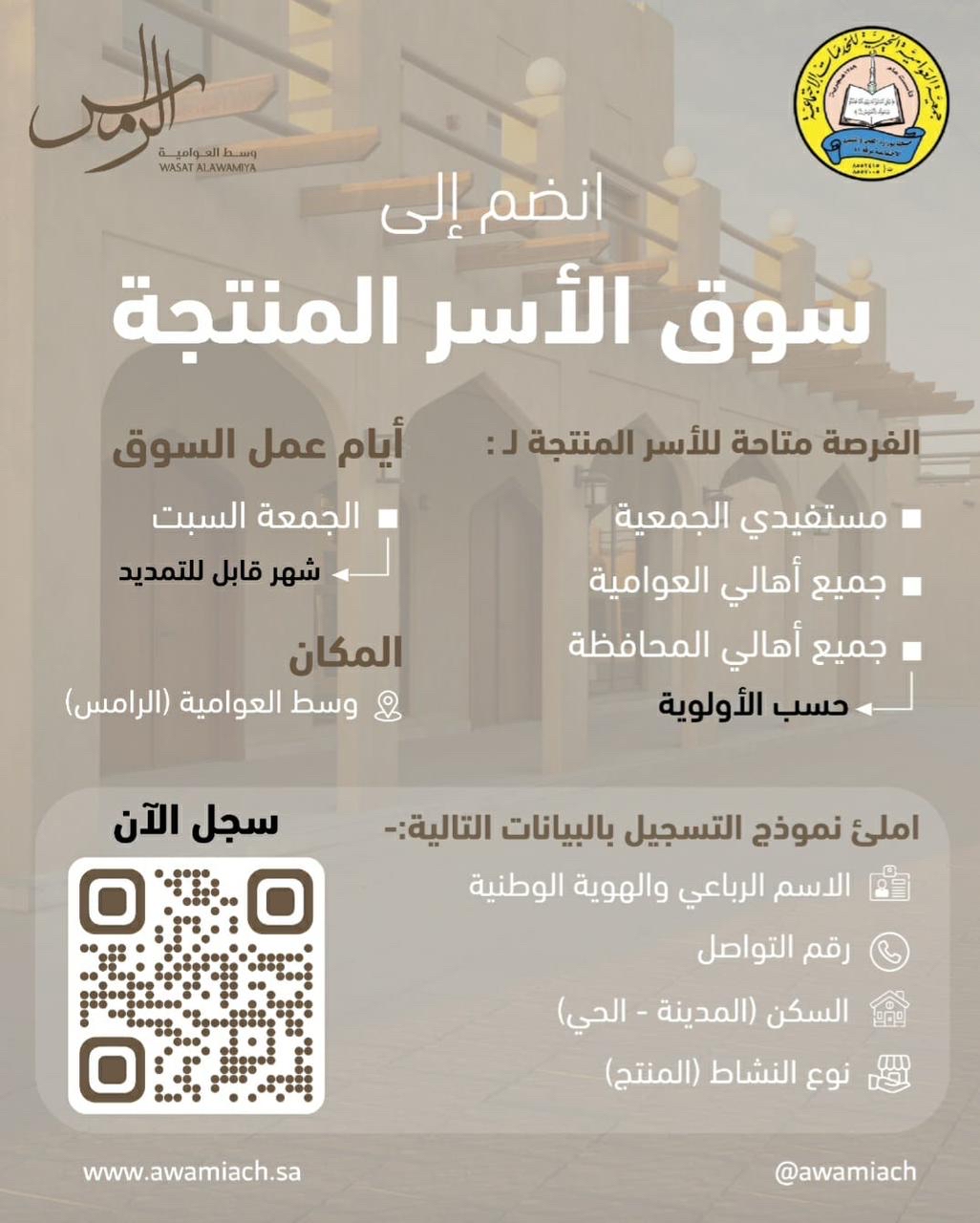 وأوضحت الجمعية أن الفرصة متاحة للأسر المنتجة من مستفيدي الجمعية، وكذلك جميع أهالي العوامية ومحافظة القطيف، وذلك حسب الأولوية.