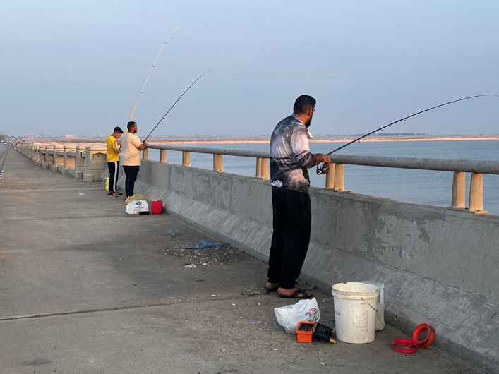 وقال عبدالله العلويات، أحد الهواة المتحمسين لصيد السمك بالسنارة: ”إن السمك عند الجسر هنا وفير ومتنوع الحجم، فنجد سمك يزن 2-3 كيلوجرامات وهناك أسماك صغيرة الحجم أيضا“.