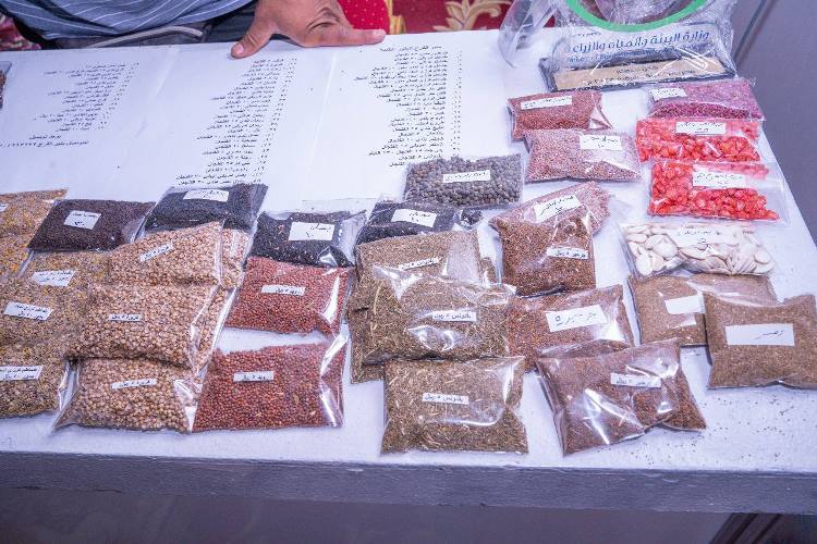 وعرض الفرج في ركنه بضعة بذور وكذلك الشتلات، منها ثمانية أنواع من بذور الطماطم كالكرزي، والقرع البلدي وغيرها.