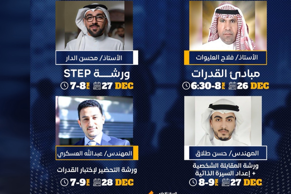 وتختتم الورش يوم الخميس، ب ”التحضير لاختبار القدرات“، يقودها المهندس عبد الله العسكري من الساعة السابعة حتى التاسعة مساءً.
