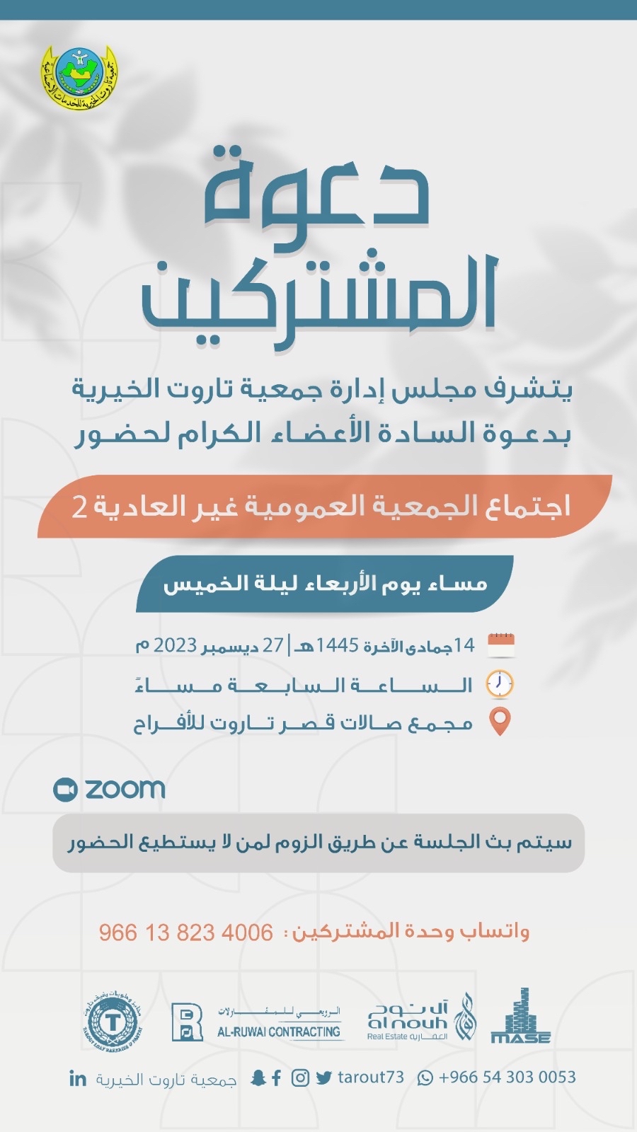 وجه مجلس إدارة جمعية تاروت الخيرية، دعوة لجميع المشتركين، لحضور اجتماع الجمعية العمومية غير العادية الثانية لعام 2023م، الذي سيعقد مساء الأربعاء في مجمع صالات قصر تاروت للأفراح والمناسبات ”توليب“.