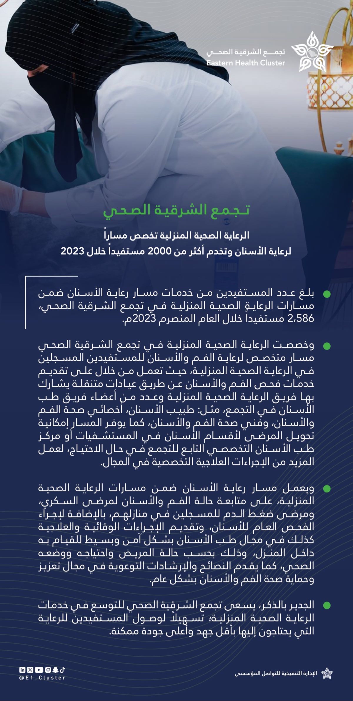 بلغ عدد المستفيدين من خدمات مسار رعاية الأسنان في تجمع الشرقية الصحي، ضمن مسارات الرعاية الصحية المنزلية في التجمع، 2,586 مستفيدًا، خلال العام المنصرم 2023 م.