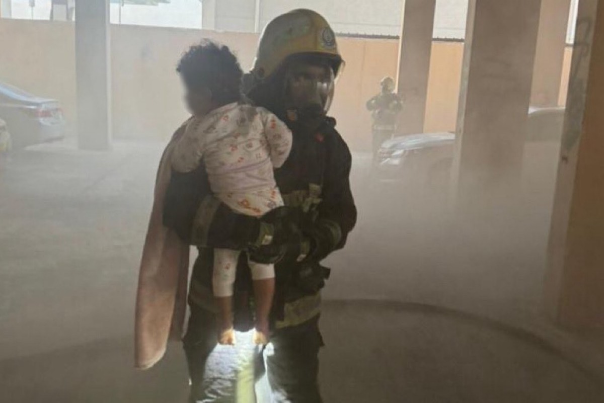 طفل في حضن رجل الإطفاء.. إخماد حريق داخل مبنى بالدمام