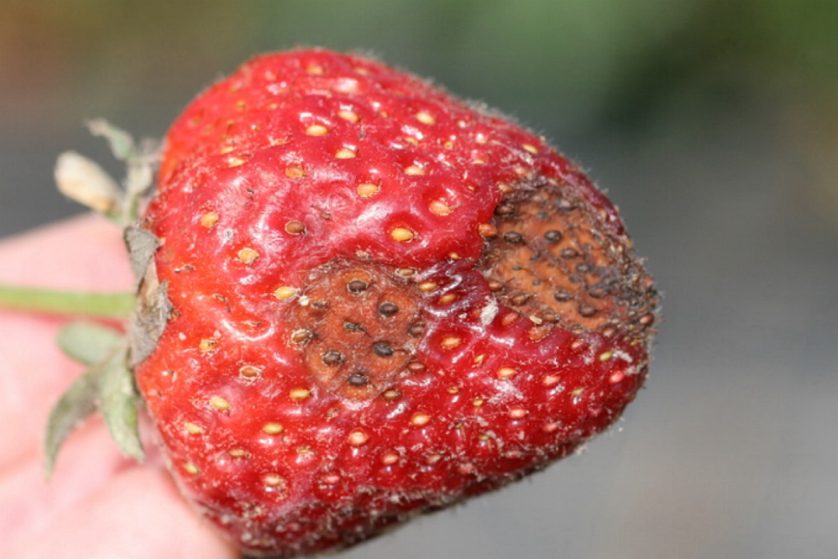 وتظهر أعراض الإصابة على الأوراق وسيقان وثمار الفراولة على شكل بقع بنية غائرة تنتشر مع مرور الوقت لتشمل تاج النبتة بأكمله.