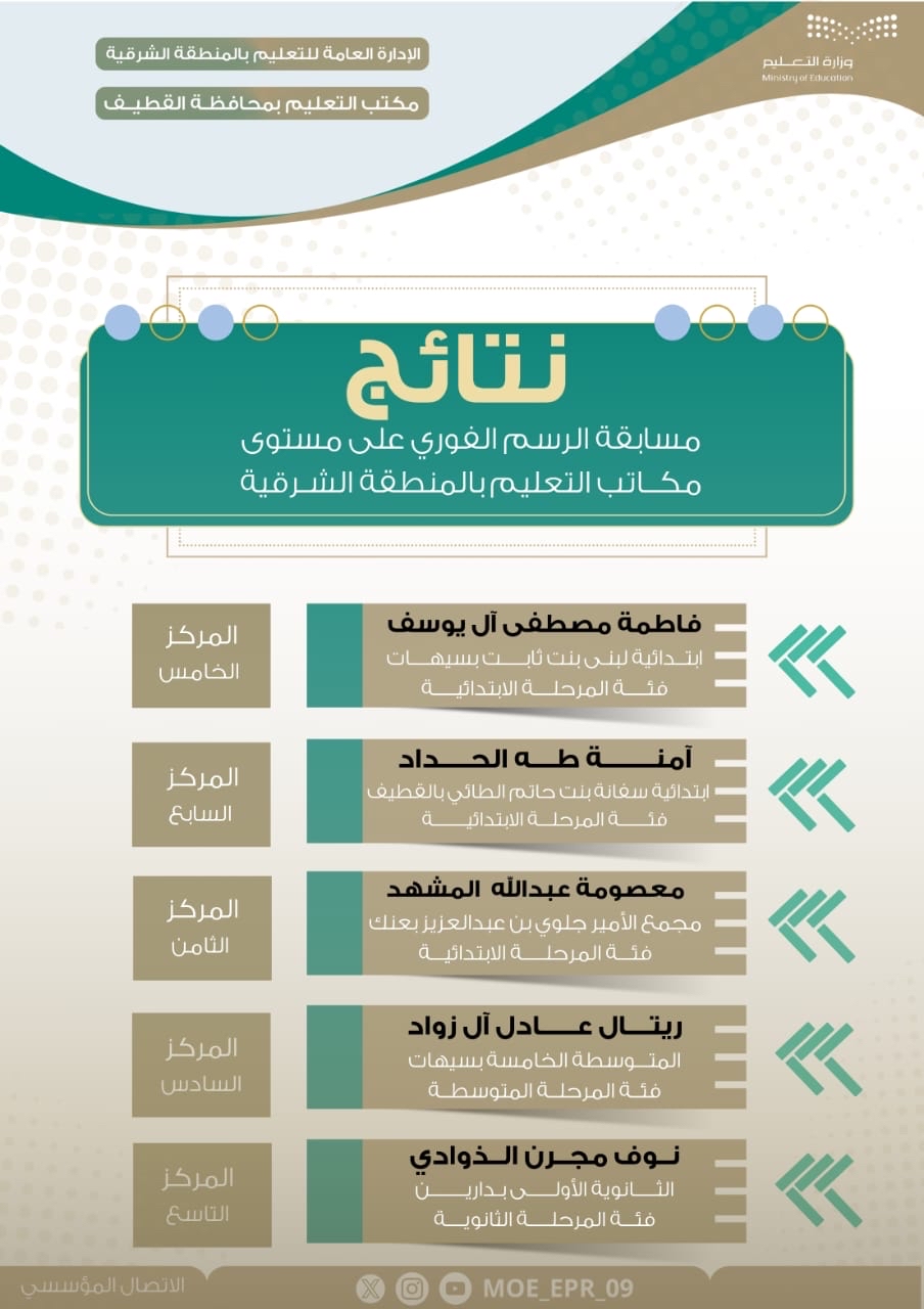 جاء ذلك في النتائج التي أعلنتها الإدارة العامة للتعليم بالمنطقة الشرقية هذا الأسبوع مهنئة الطالبات الحاصلات على المراكز المتقدمة على فوزهن.