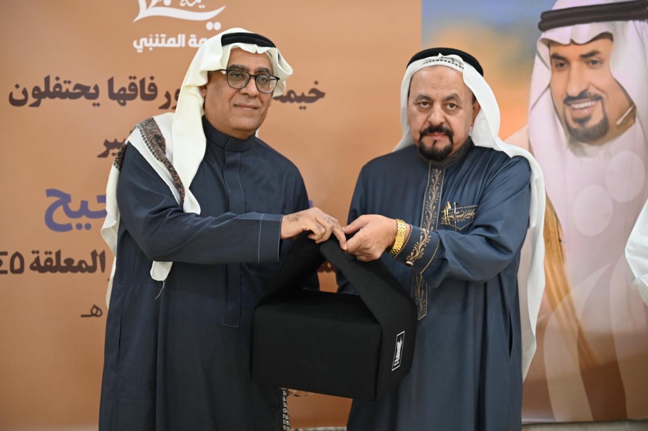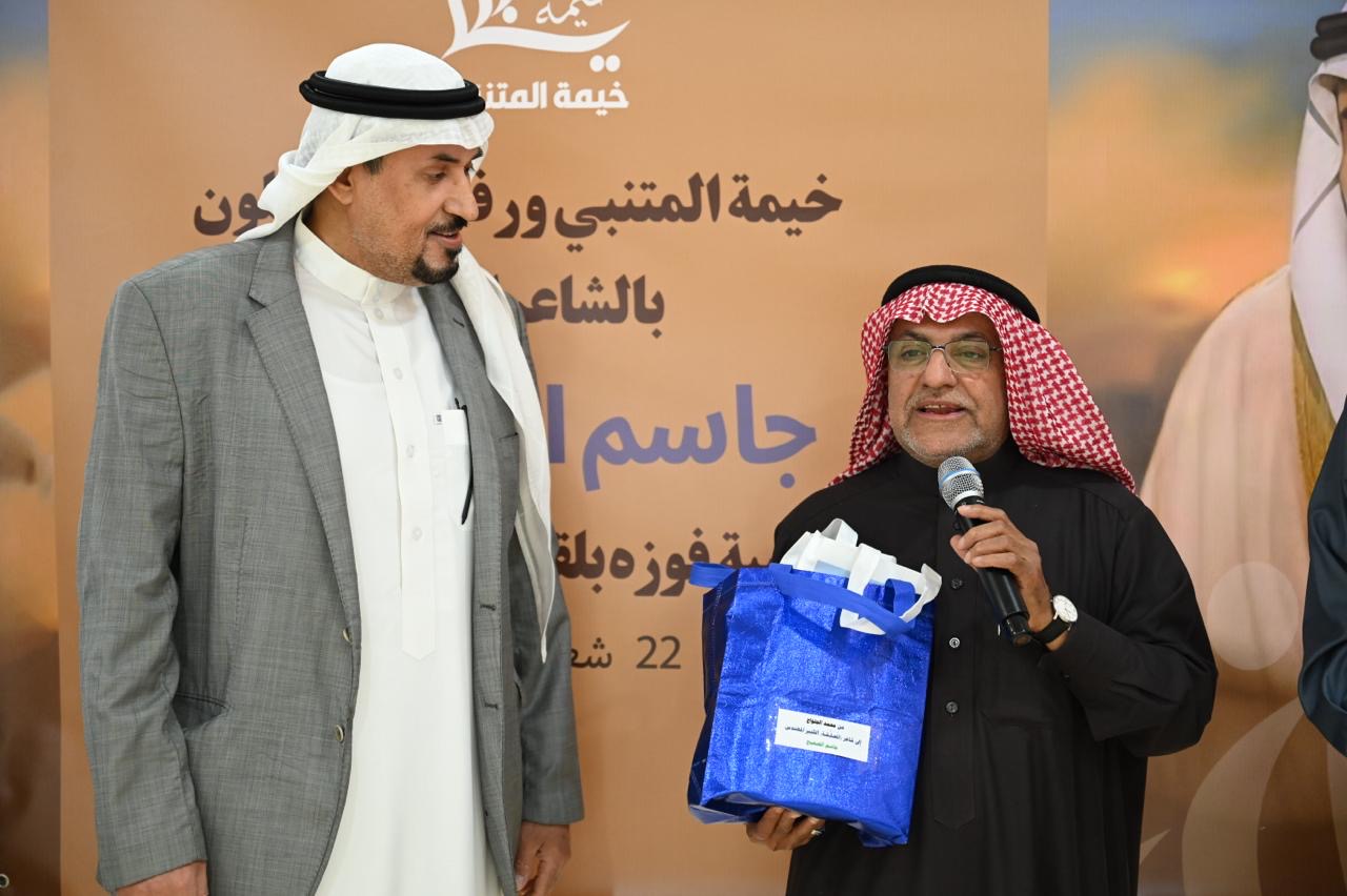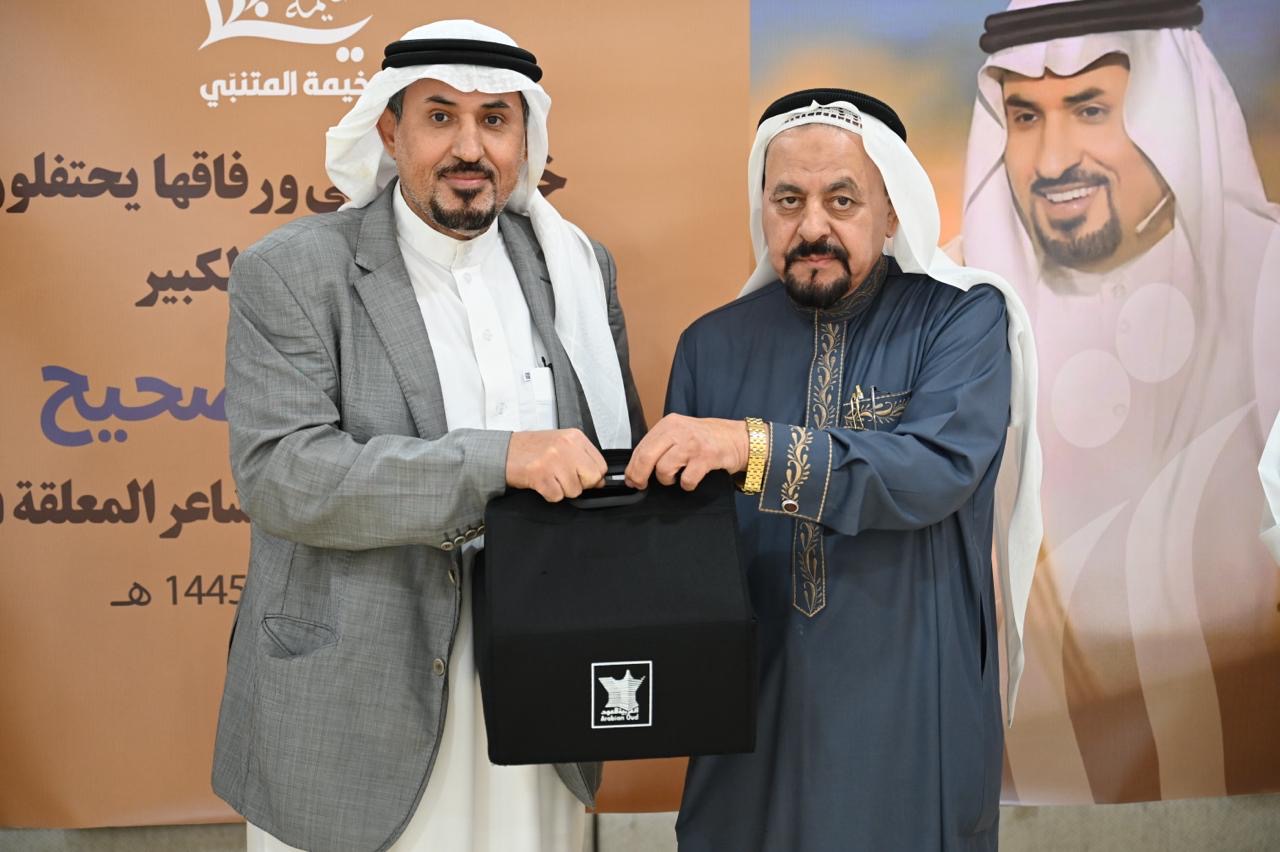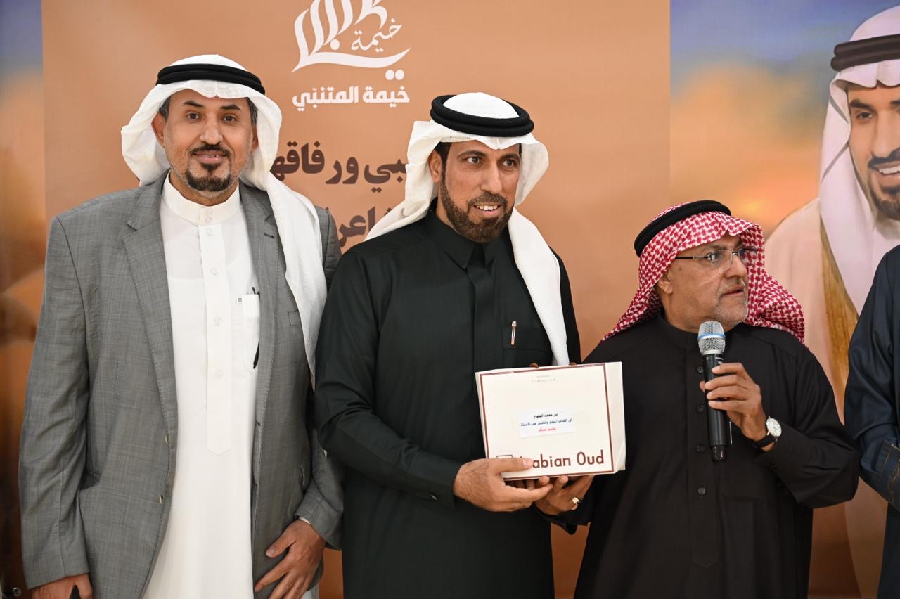 وقدم الشاعر حيدر العبدالله إهداء خاص عبارة عن نسخة تراثية نادرة من ديوان ”المتنبي“ إلى الشاعر جاسم الصحيح المتيم بعشق الشاعر العباسي.