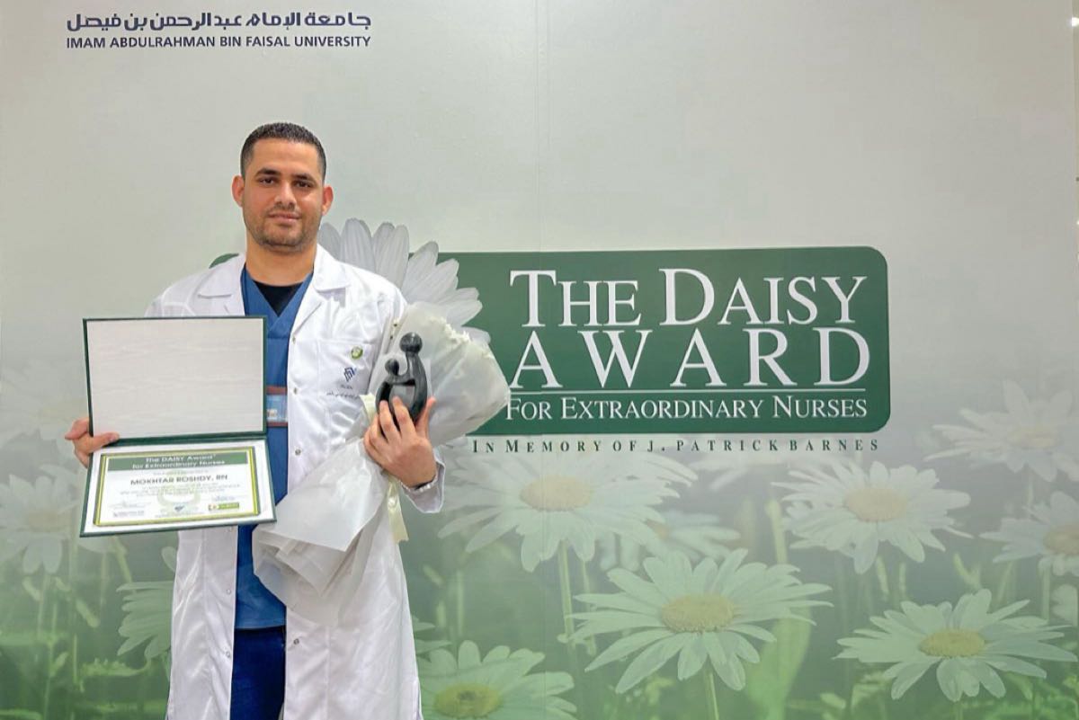 دشن رئيس جامعة الامام عبدالرحمن بن فيصل المشرف العام على المستشفى الجامعي بالخبر الأستاذ الدكتور عبدالله الربيش، جائزة ديزي العالمية للمستشفى الجامعي، وكرم المتميزين في رعاية المرضى.