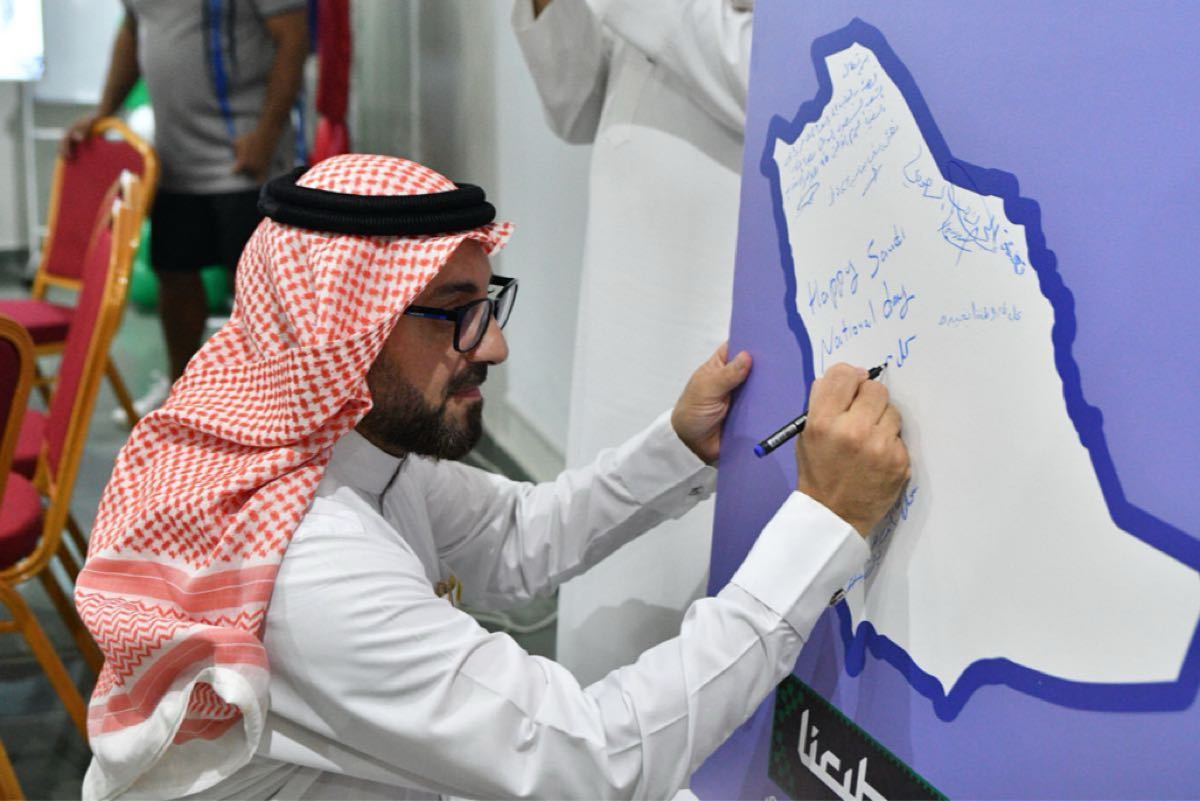 وأتاحت الفعالية للمشاركين التعبير عن مشاعرهم الوطنية عبر جدارية خُصصت لكتابة التهاني، ومسابقة لأجمل لوحة فنية وطنية.