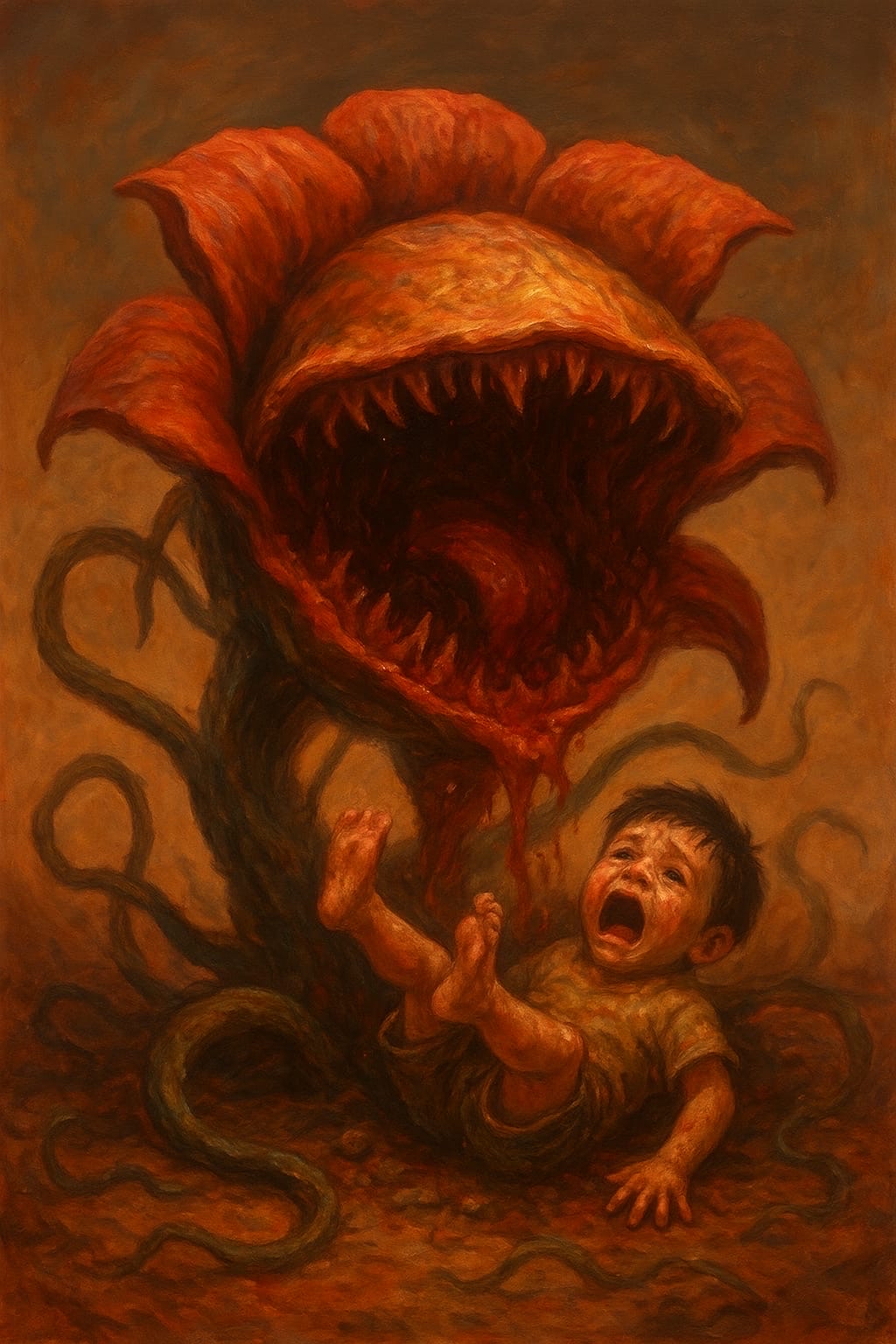 كانت زهرة عملاقة تبتلع صبيا في الثالثة أو الرابعة، وقد طارت رجلاه في الهواء تركلان اللاشيء.. وسمعَت صوت غرغرة مكتوما خافتاً..