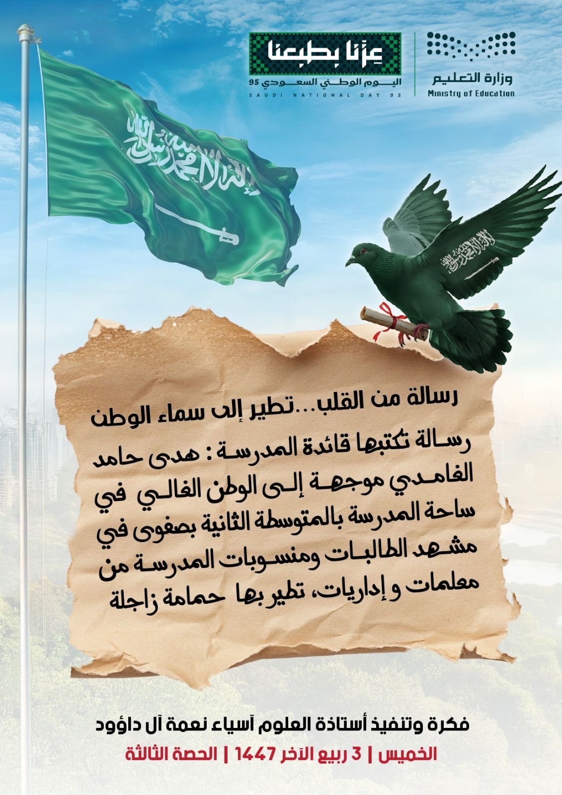 وتضمنت الفعالية قيام قائدة المدرسة بكتابة رسالة وجدانية، عبرت فيها عن مشاعر الحب والاعتزاز بالوطن وقيادته الرشيدة ومنجزاته، قبل أن يتم ربطها بحمامة زاجلة وإطلاقها في ساحة المدرسة أمام الطالبات ومنسوبات التعليم، لترتفع حاملةً معها رسالة رمزية بأن حب الوطن لا يعرف حدودًا.
