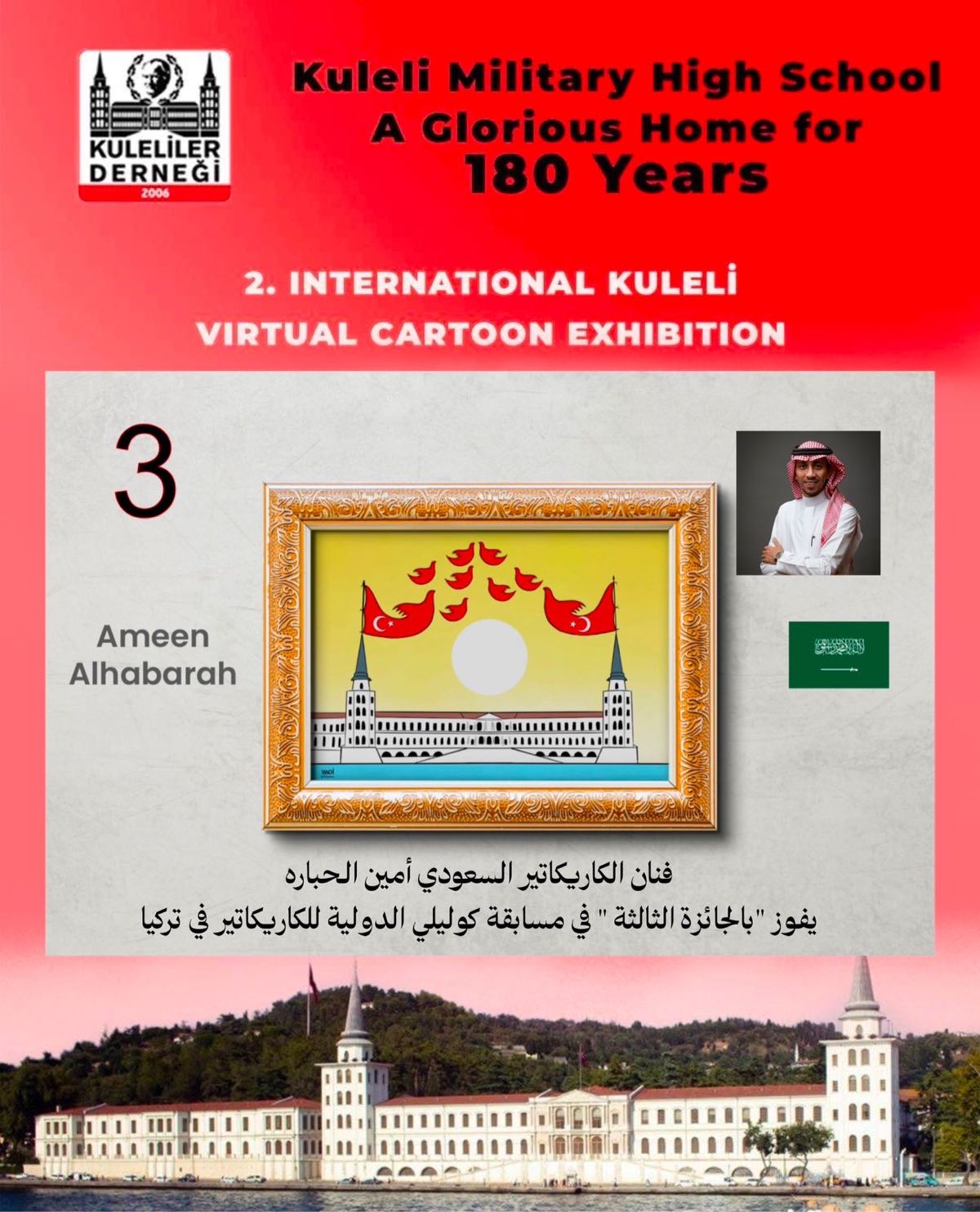 أضاف فنان الكاريكاتير السعودي، أمين الحباره، إنجازاً دولياً جديداً إلى مسيرته الحافلة، بفوزه بالمركز الثالث في مسابقة كوليلي الدولية للكاريكاتير في تركيا.
