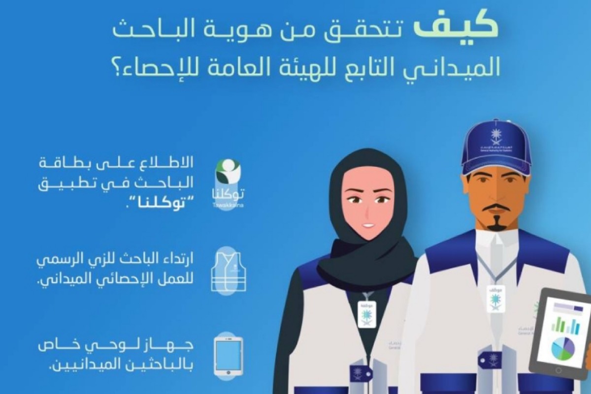 أتاحت الهيئة العامة للإحصاء خدمة التحقق من هوية الباحث الميداني عبر تطبيق ”توكلنا“.