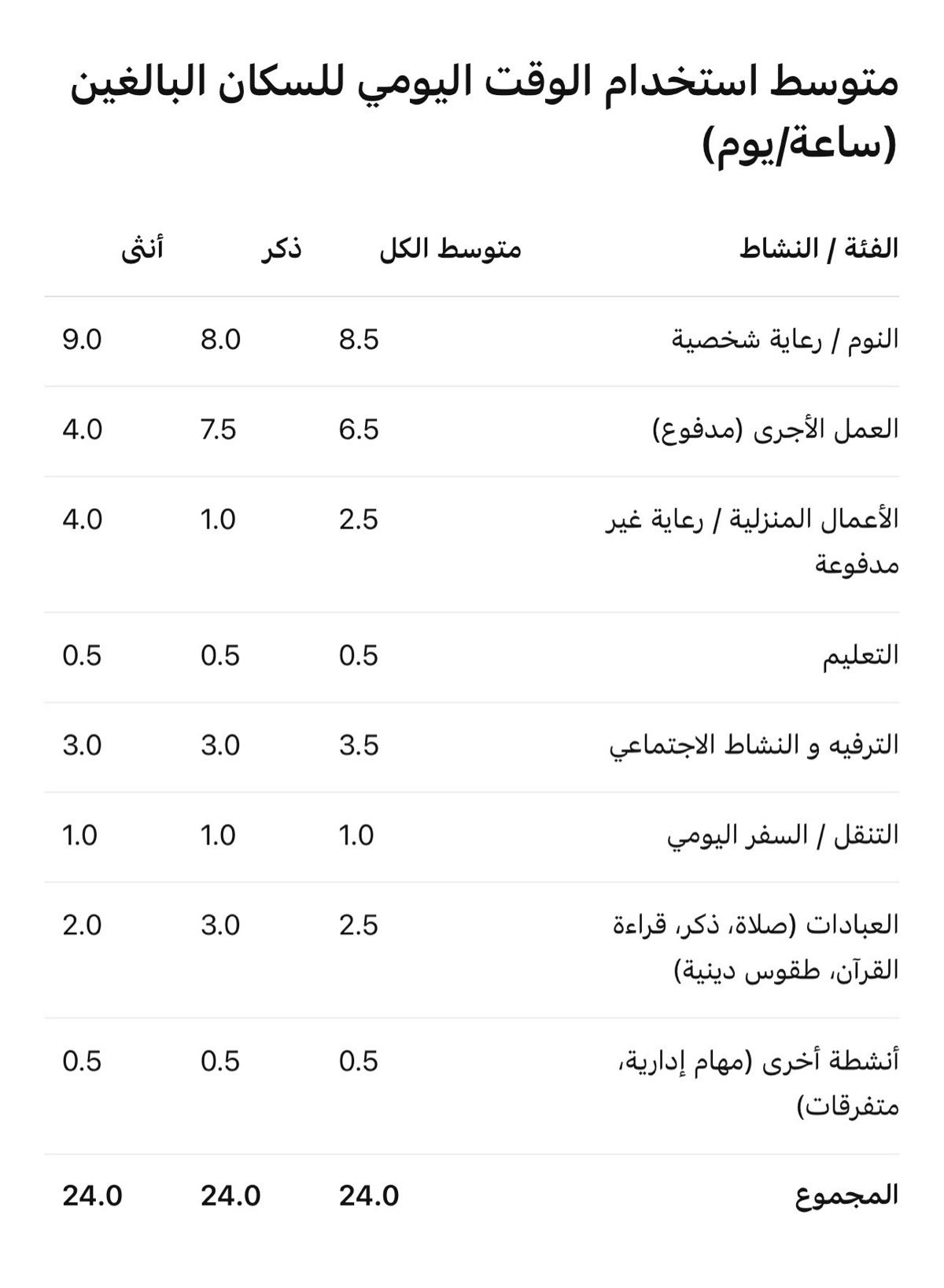 • هناك اختلاف واضح بين الجنسين في توزيع الوقت، مع تركيز الإناث على الأعمال المنزلية والذكور على العمل والعبادات.