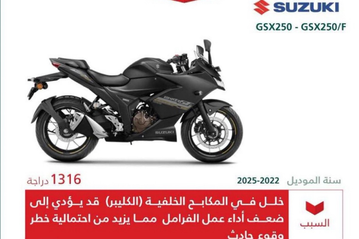 أعلنت وزارة التجارة عن استدعاء 1,316 دراجة نارية من طراز ”سوزوكي GSX250“ و”GSX250/F“، والتي تشمل الموديلات المصنعة بين عامي 2022 و 2025. في إجراء عاجل يهدف إلى ضمان سلامة قائدي الدراجات النارية.
