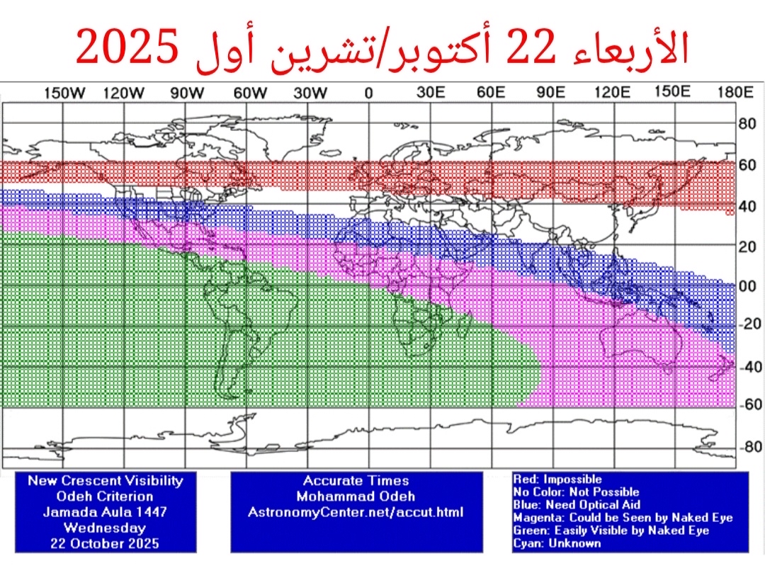 وأشار إلى انه سيتسنى رؤية الهلال بسهولة في عموم مناطق أمريكا الجنوبية وأغلب أنحاء أمريكا الوسطى، بينما ستكون الرؤية ممكنة فقط باستخدام المناظير الفلكية في مناطق أمريكا الشمالية، وذلك بفضل تحسن مواصفات الهلال من حيث الارتفاع والمكث والإضاءة في تلك المناطق.