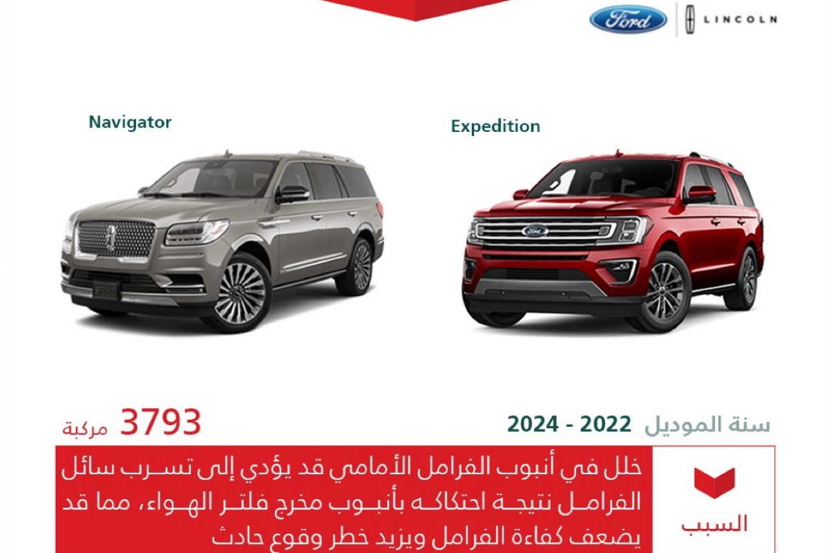 أعلنت وزارة التجارة عن استدعاء فوري لـ 3,793 مركبة، تشمل طرازي لينكون ”Navigator“ وفورد ”Expedition“ من موديلات 2022 إلى 2024، وذلك لوجود خلل مصنعي قد يهدد سلامة الركاب.