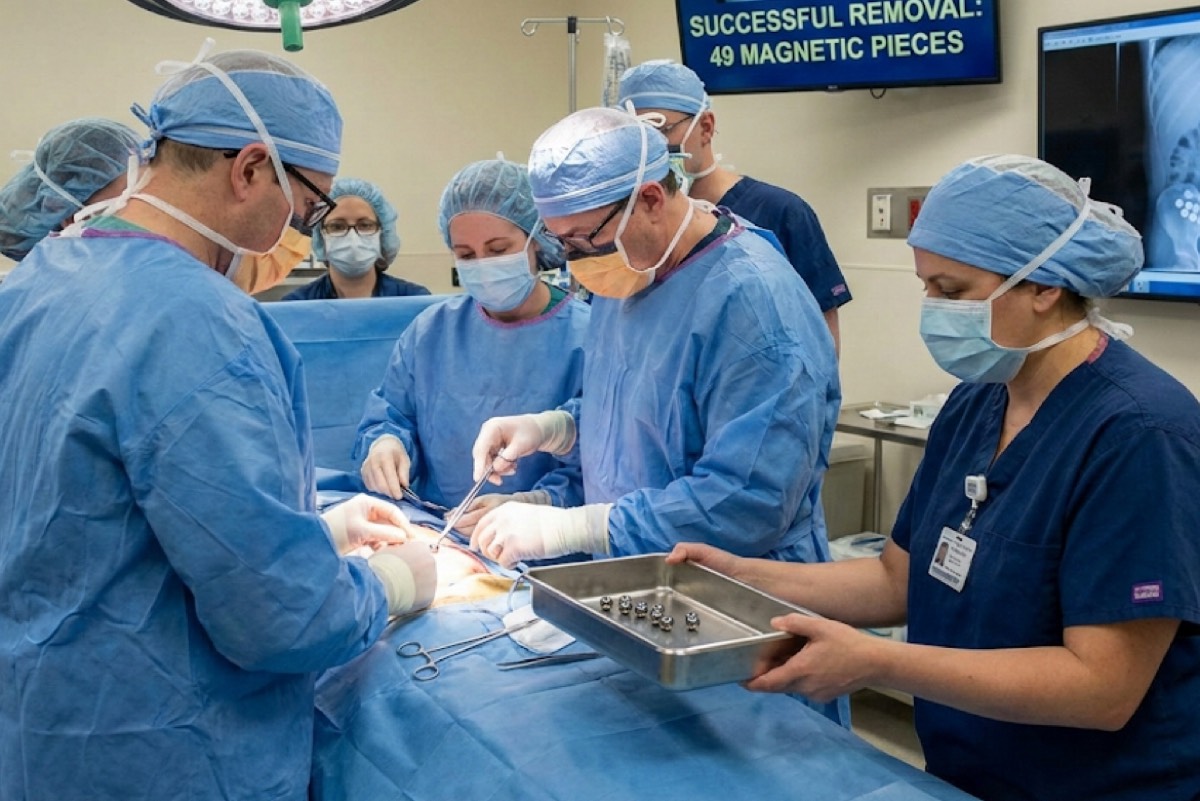 واستقبل قسم الطوارئ بالمستشفى الطفل وهو يعاني من آلام حادة ومجهولة في البطن، ليسارع الأطباء بإجراء الفحوصات الإشعاعية الدقيقة التي كشفت المفاجأة الصادمة بوجود 49 جسماً معدنياً ”مغناطيس“ مستقرة داخل المعدة والأمعاء الدقيقة.
