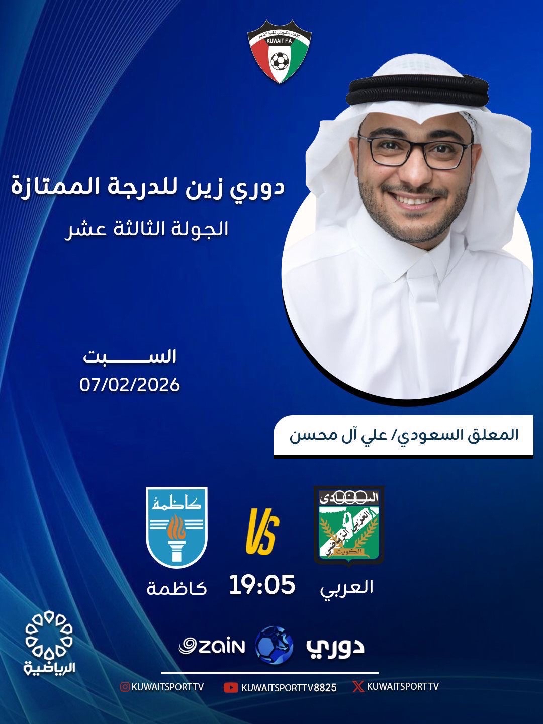 يستعد المعلق السعودي لمرافقة المشاهدين عبر شاشة قناة الكويت الرياضية، واضعاً صوته على أحداث لقاءٍ لا يقبل القسمة على اثنين، حيث يسعى ناديا العربي وكاظمة لخطف النقاط الثلاث في مرحلة حاسمة من عمر الدوري.