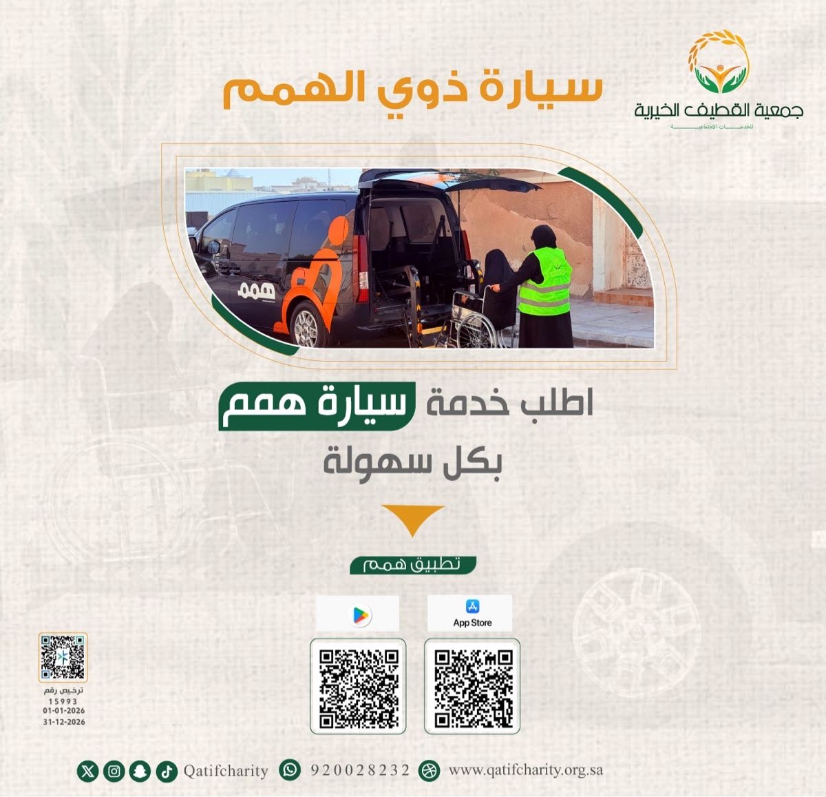 أطلقت جمعية القطيف الخيرية تطبيق ”هِمم“ عبر المتاجر الذكية، لتمكين ذوي الإعاقة وكبار السن من طلب خدمات النقل المتخصص بيسر، بهدف تعزيز جودة حياتهم وضمان تنقلهم الآمن للمواعيد الطبية والوجهات المختلفة.