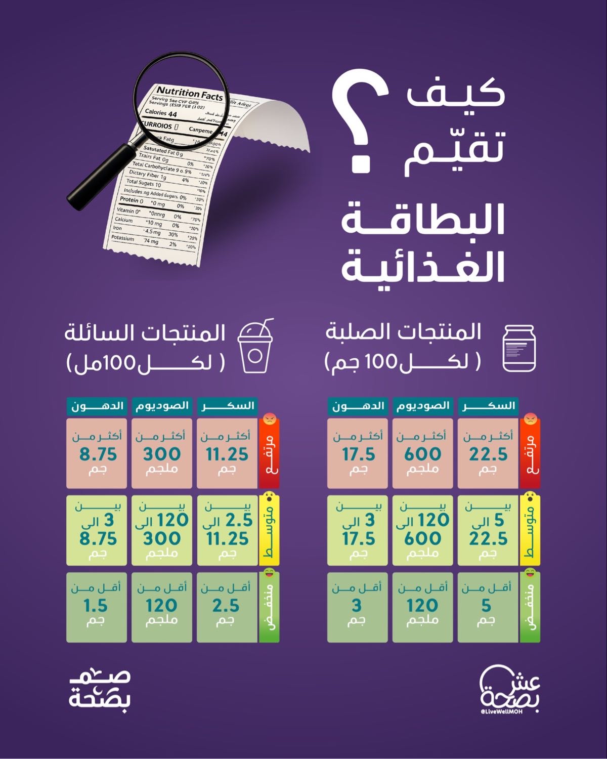 واعتمدت المبادرة في تصنيفها للمنتجات السائلة على معيار قياس القيم لكل 100 مليلتر، مقسمة إياها إلى ثلاثة مستويات لونية تحدد درجة الملاءمة والخطورة الصحية بوضوح تام لتسهيل المقارنة.