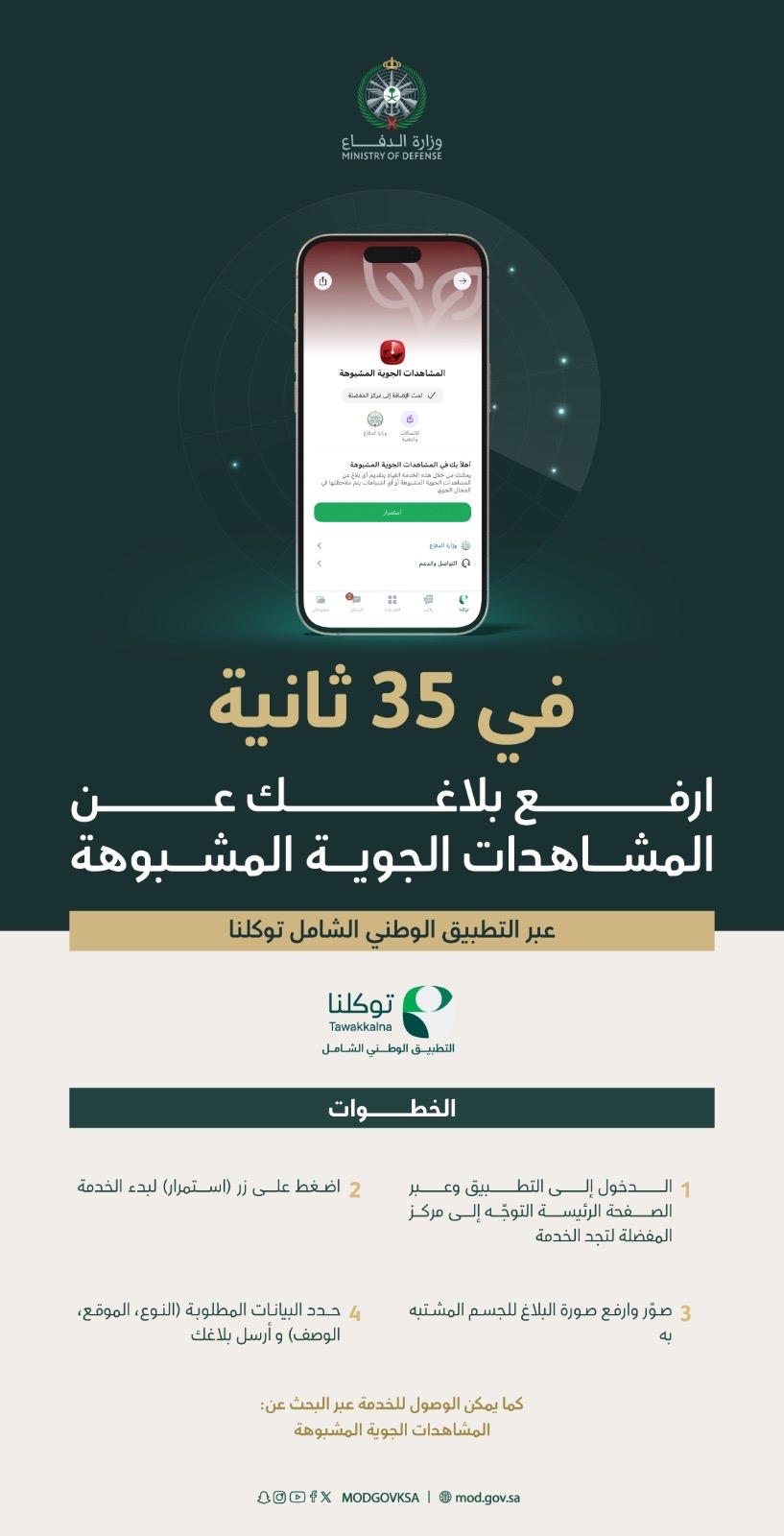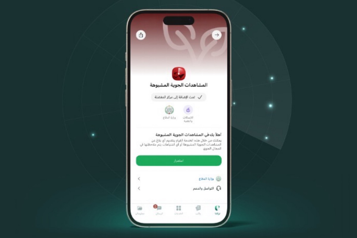 أطلقت وزارة الدفاع السعودية عبر تطبيق «توكلنا» خدمة نوعية تتيح للمواطنين والمقيمين الإبلاغ الفوري عن أي مشاهدات جوية مشبوهة كمسيرات أو صواريخ، لضمان سرعة الاستجابة وحماية مقدرات الوطن.